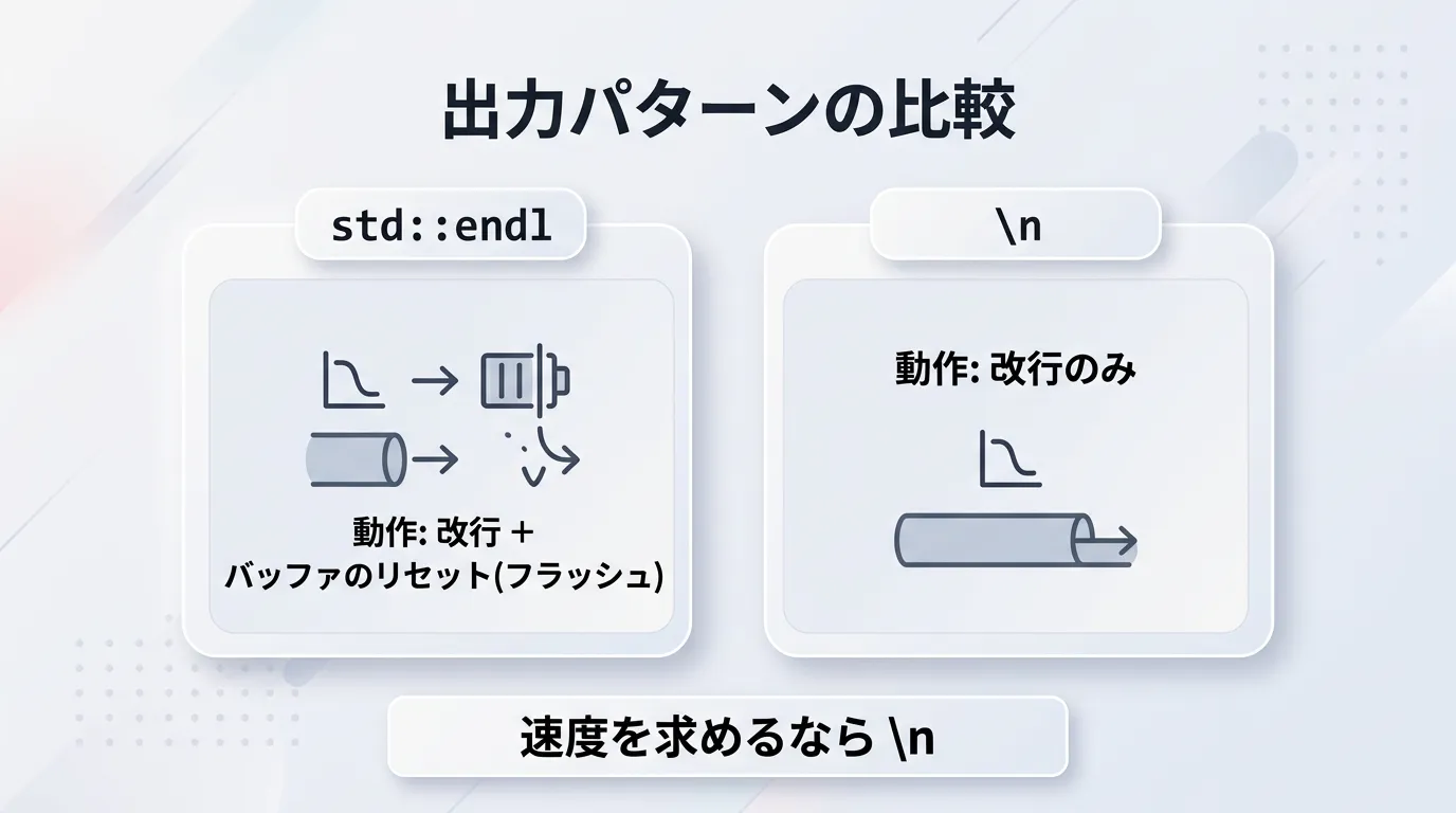 std::endlは、改行を行うと同時に、出力バッファを強制的に空にするフラッシュ(flush)という処理を行います。