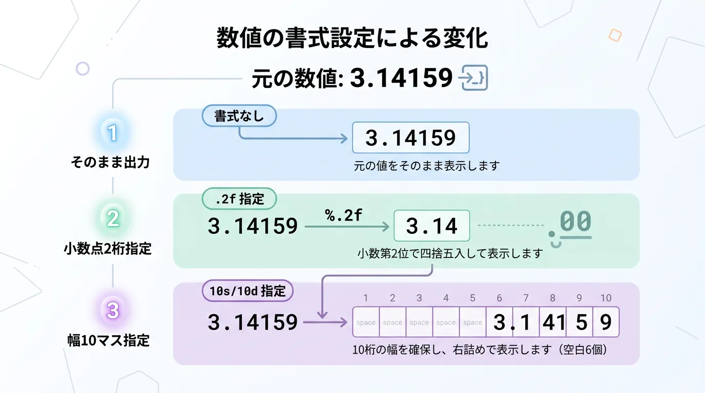数値を表示する際、小数点以下の桁数を指定したり、特定の幅で表示したい場合があります。