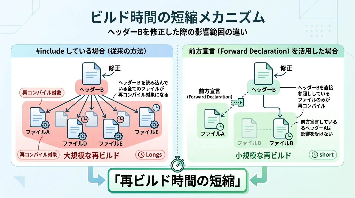 #includeを使用すると、インクルード先のヘッダーファイルが少しでも変更された場合、そのヘッダーを読み込んでいる全てのソースファイルが再コンパイルの対象になります。