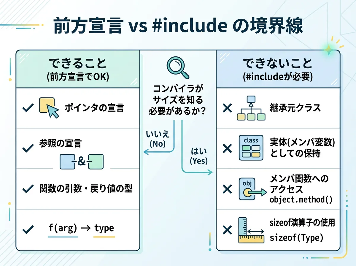 コンパイラが「型の中身(サイズやメンバ)」を知る必要がある状況では、必ず#includeによる完全な定義が必要になります。