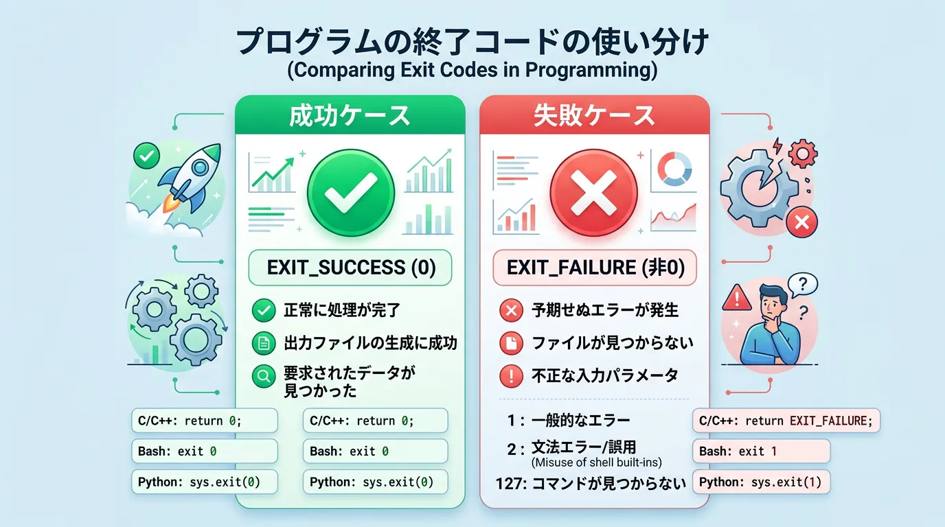 EXIT_SUCCESSは「成功」、EXIT_FAILUREは「何らかの失敗」を意味します。