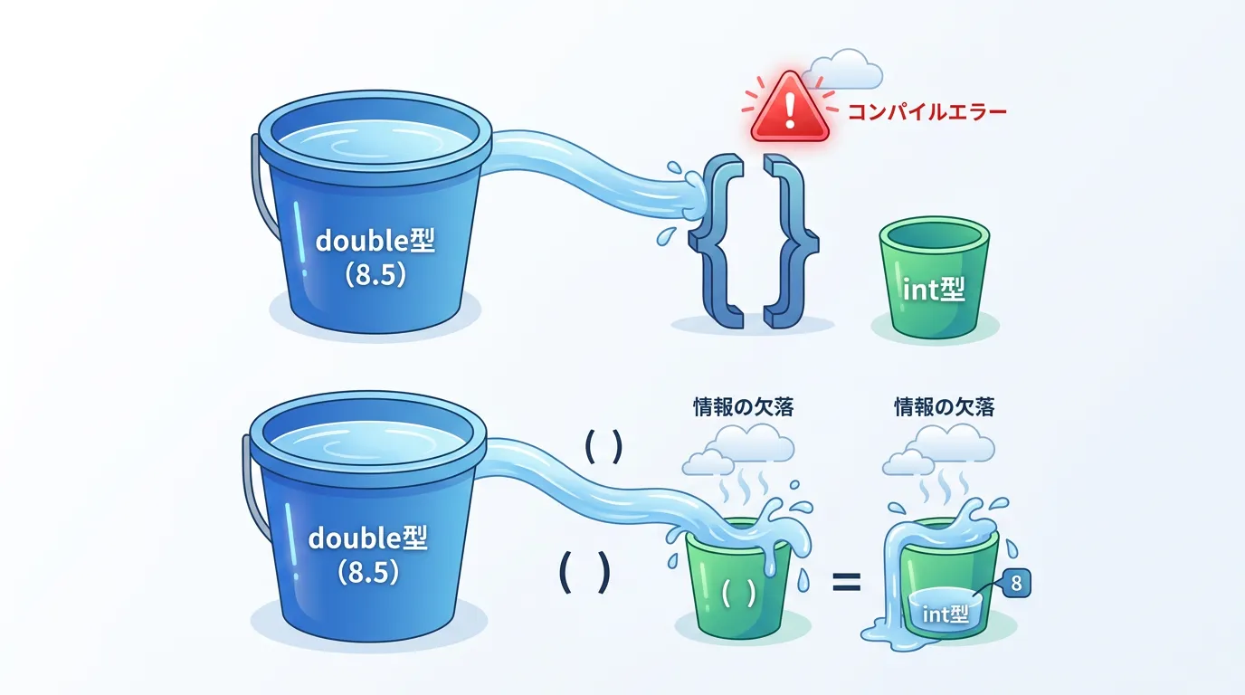 - 安全性の向上:ナローイング変換を防ぎ、意図しないデータの欠落をコンパイル時に検出できる。