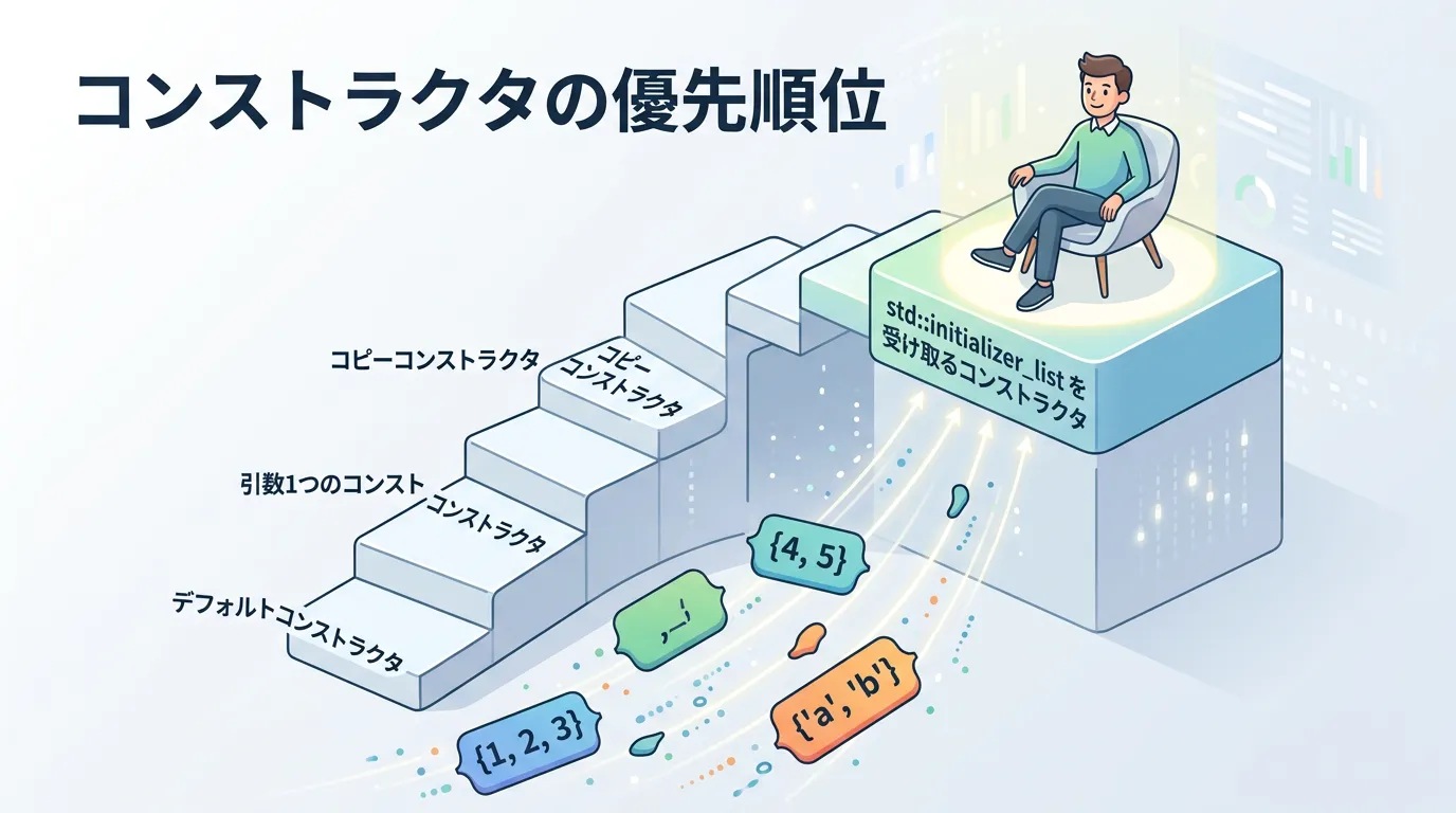クラスにstd::initializer_listを引数に取るコンストラクタが存在する場合、波括弧を用いた初期化は他のコンストラクタよりも優先的にそれが選ばれるという特性があります。
