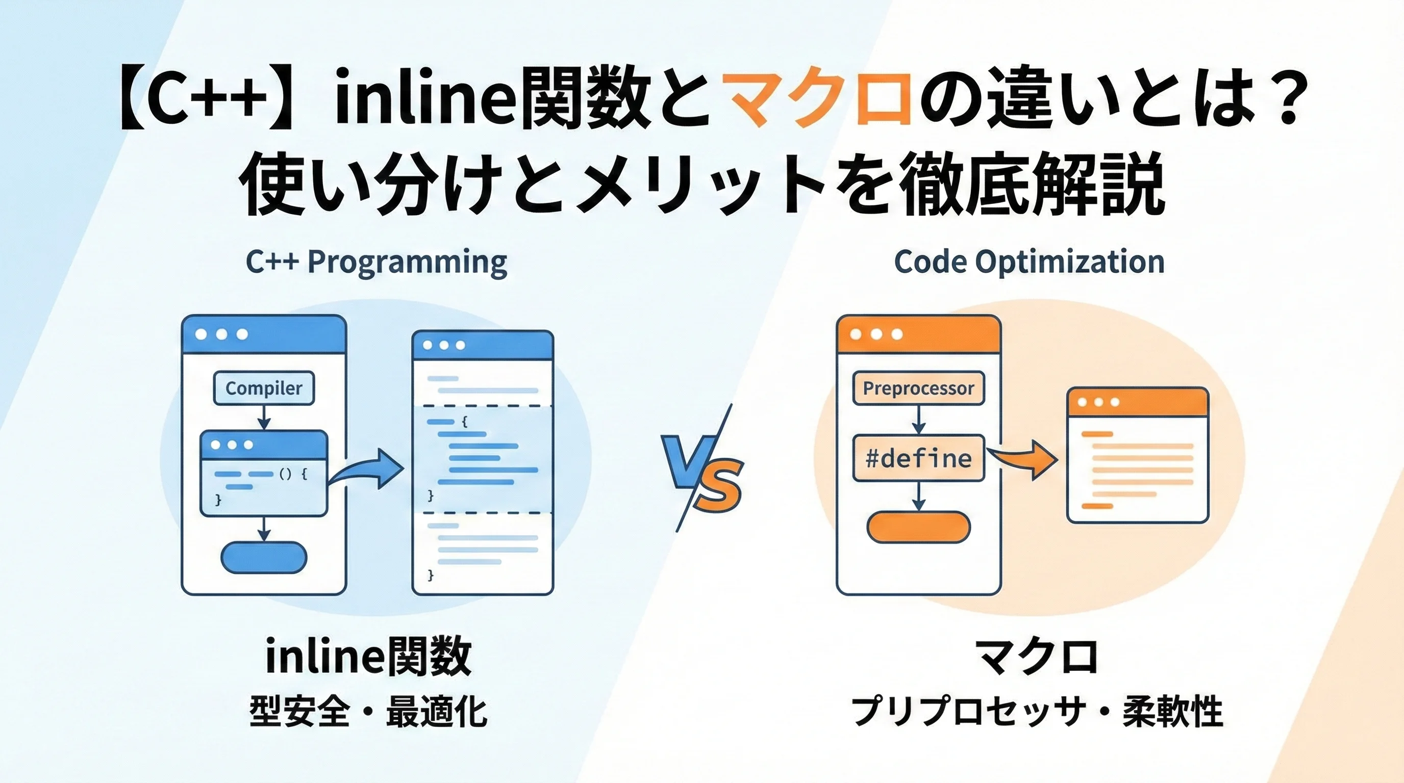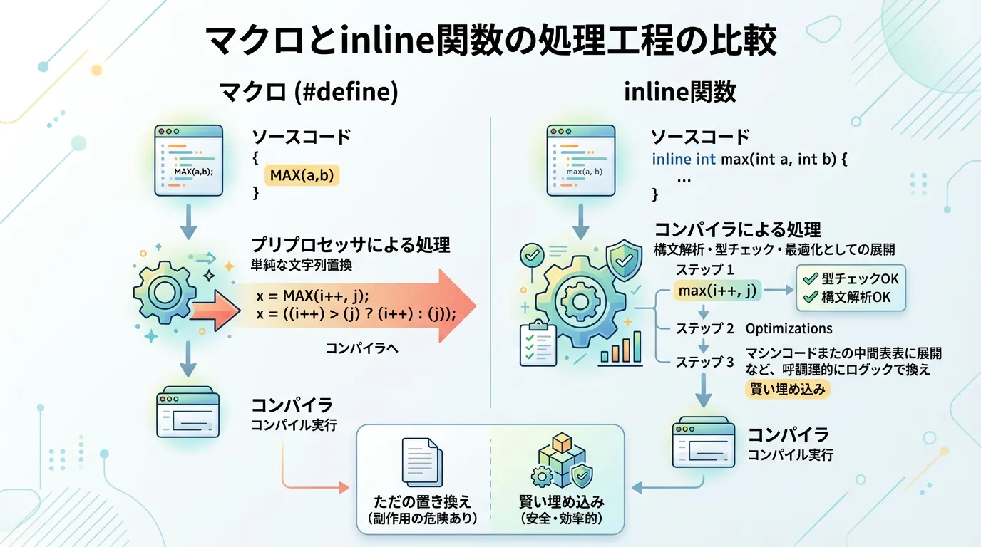 マクロとinline関数は、どちらも「関数呼び出しのオーバーヘッドを減らす」という目的で使われますが、その処理が行われるタイミングと仕組みが根本的に異なります。
