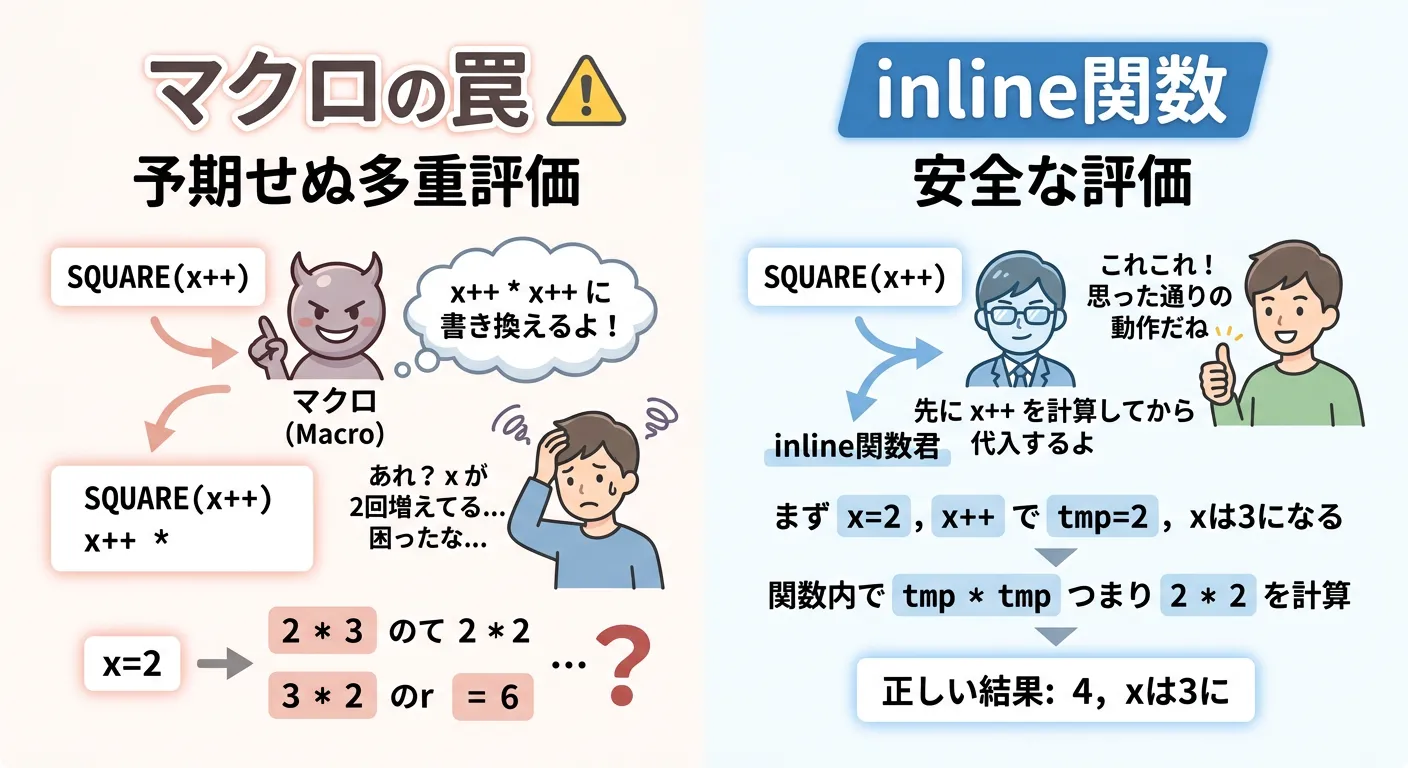 これが、現代のC++でマクロよりもinline関数が推奨される最大の理由の一つです。