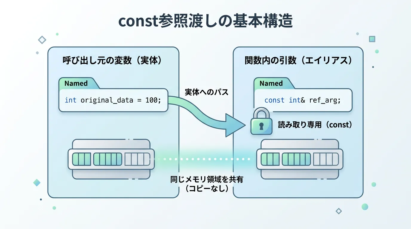 C++における「const参照渡し」とは、関数の引数に対してconst 型名& 変数名という形式で宣言を行い、呼び出し元のデータを「コピーせず、かつ書き換えを禁止した状態」で参照する手法のことです。