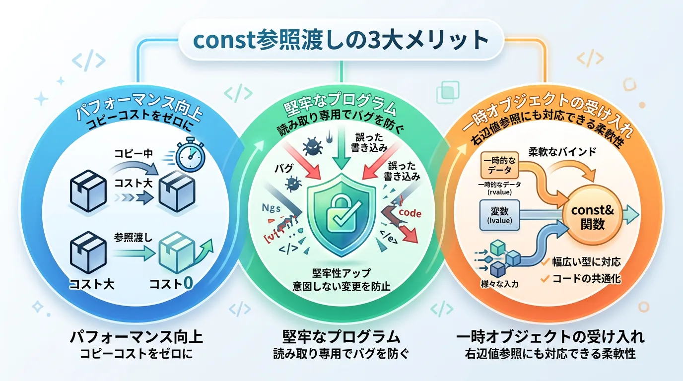 constによって意図しないデータの書き換えをコンパイルレベルで阻止する。 - 柔軟性:一時オブジェクト(右辺値)も引数として受け取ることができる。