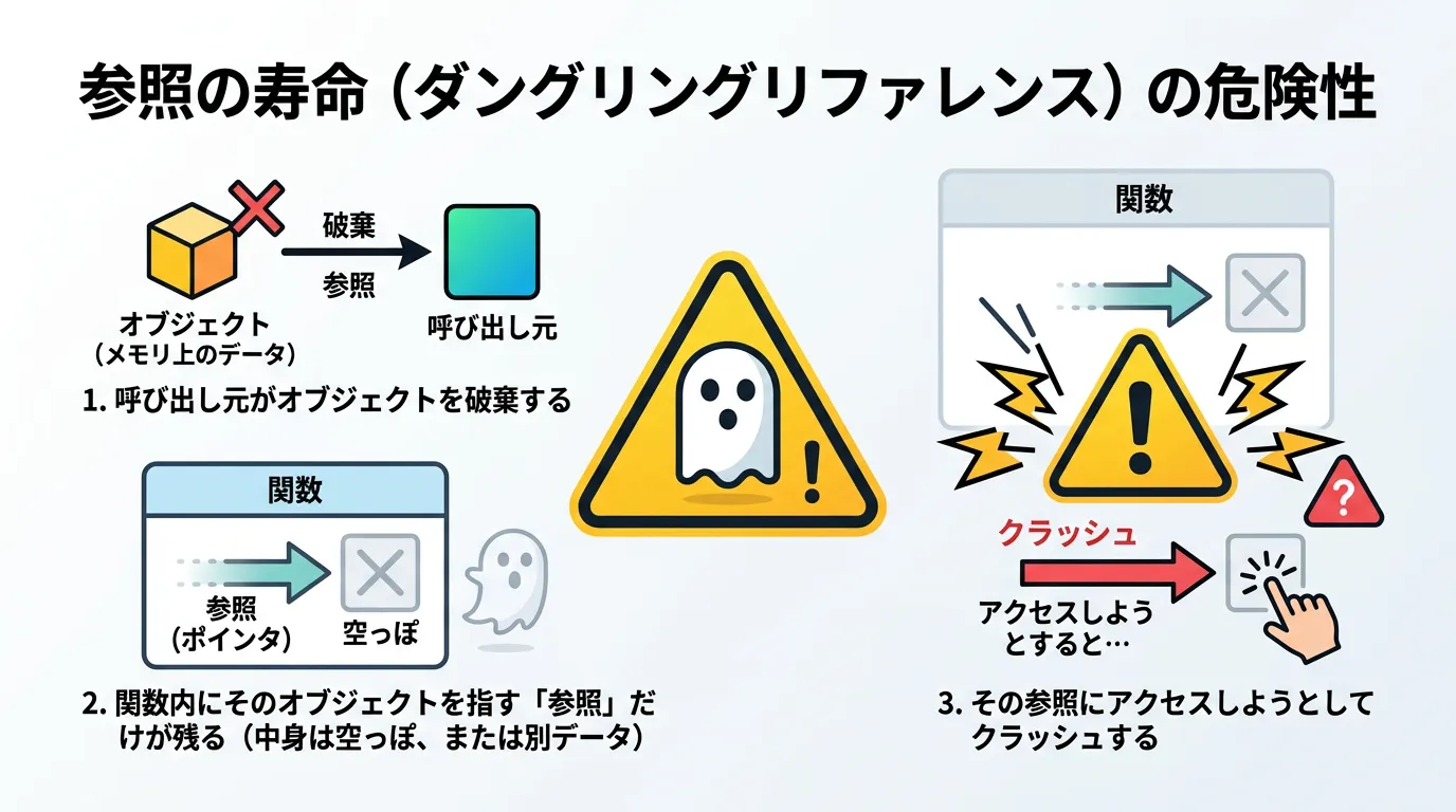 もし、関数が終了した後もその参照を保持し続け(グローバル変数に保存するなど)、呼び出し元で元のオブジェクトが破棄された場合、その参照は無効なメモリ領域を指すことになります。