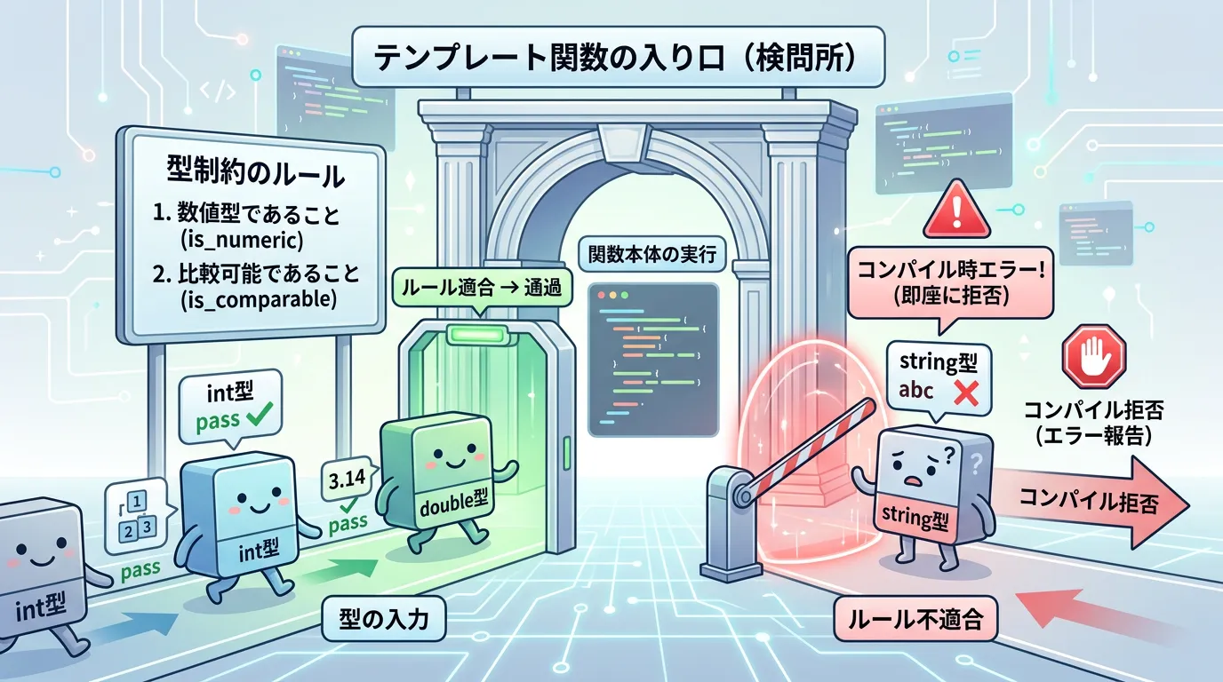 Conceptsを利用することで、void*では到底不可能だった「型の性質に基づいた厳密な制御」が可能になります。