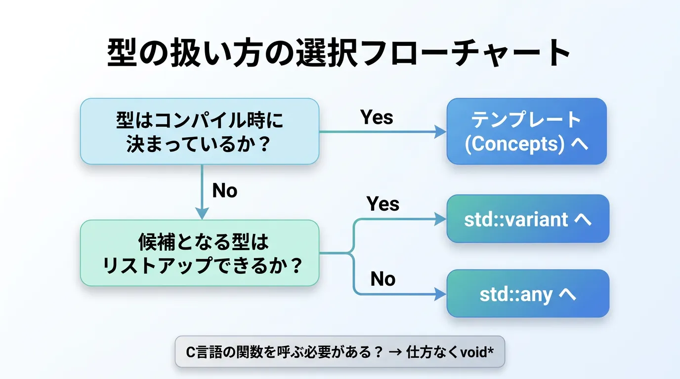 コンパイル時に解決できるものはテンプレートで、候補が絞られているならstd::variantで、どうしても自由度が必要な場合のみstd::anyを選択するのが現代的なC++のベストプラクティスです。