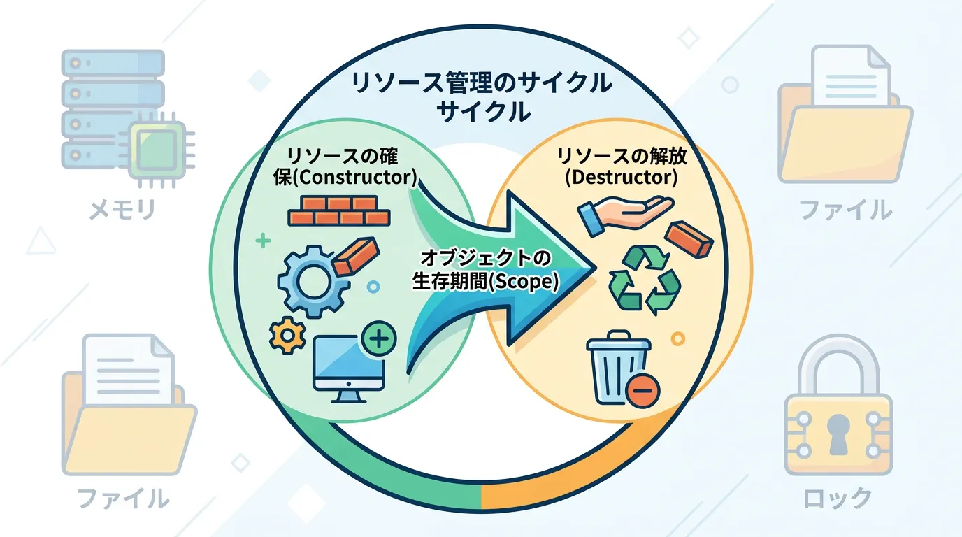 RAIIは、メモリリークやファイルの閉じ忘れ、デッドロックといった、プログラマーを長年悩ませてきたバグを言語仕様のレベルで自動的に解決する手法です。