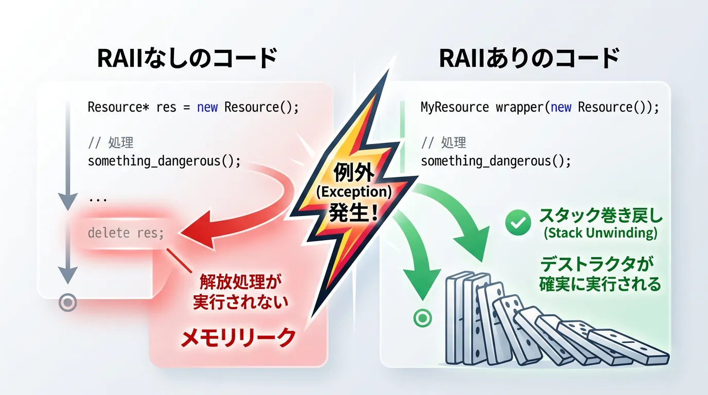このように、RAIIは「例外安全(Exception Safety)」を実現するための必須テクニックです。
