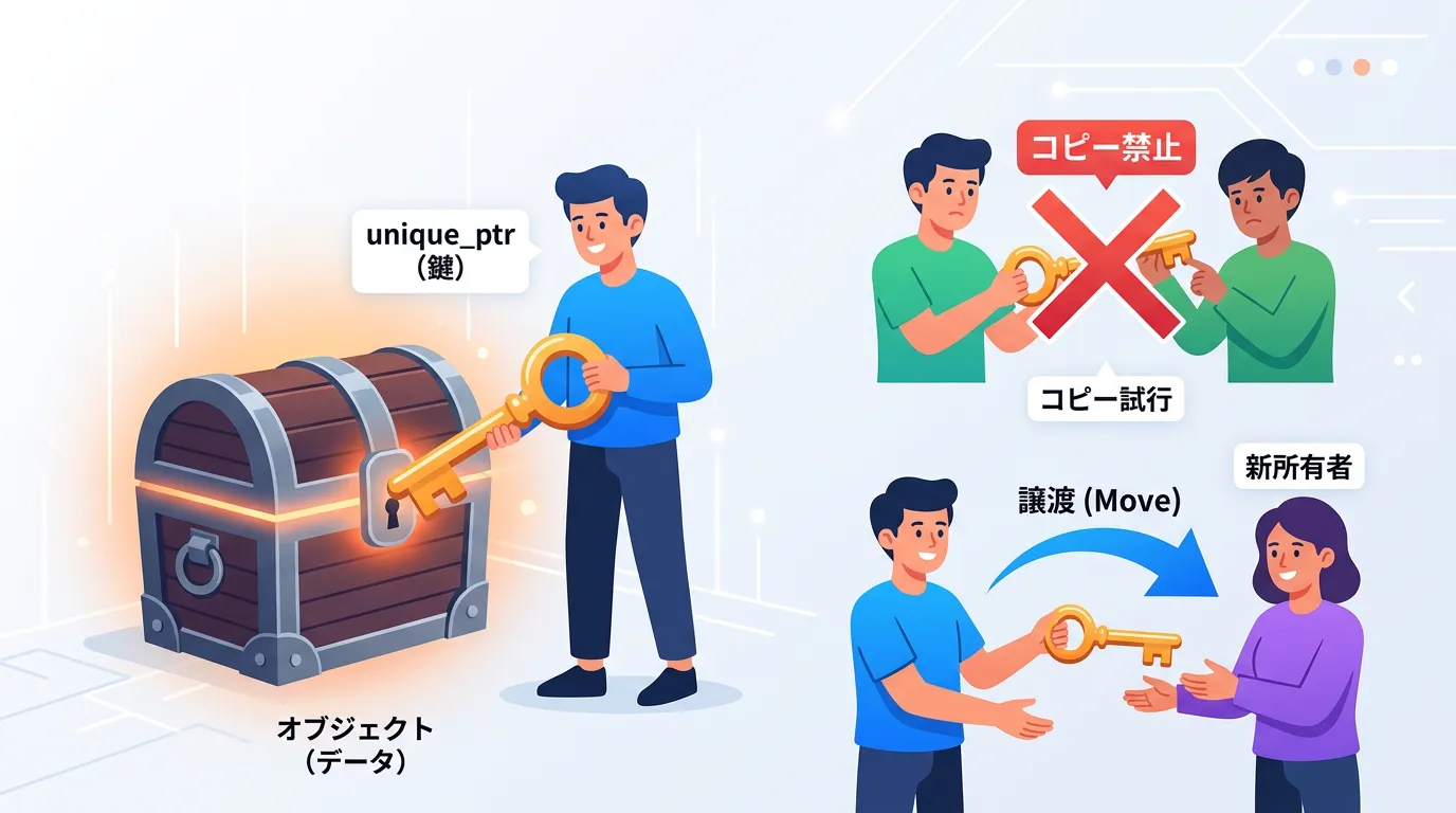std::unique_ptrは、その名の通り「所有権を一人だけが持つ」タイプのスマートポインタです。