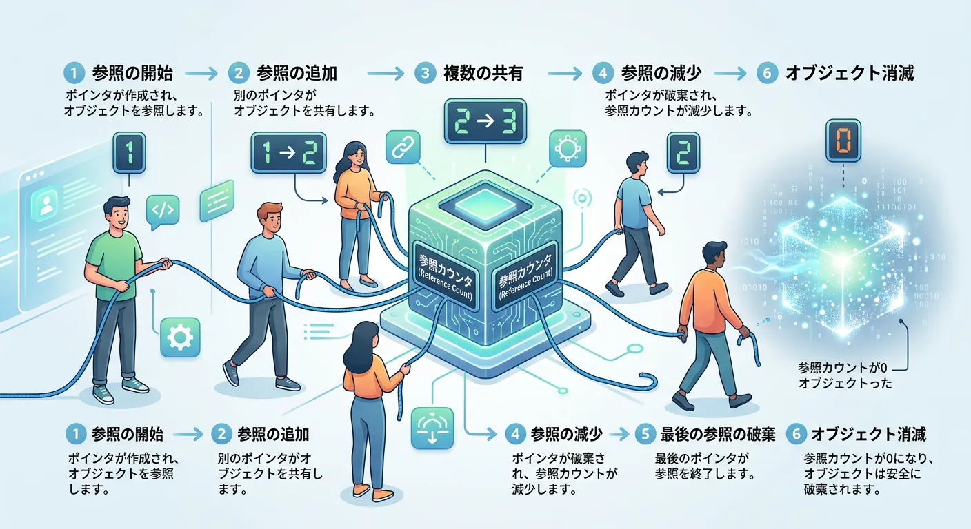 内部で「参照カウンタ」という仕組みを持っており、そのオブジェクトを指しているポインタがいくつあるかを管理しています。