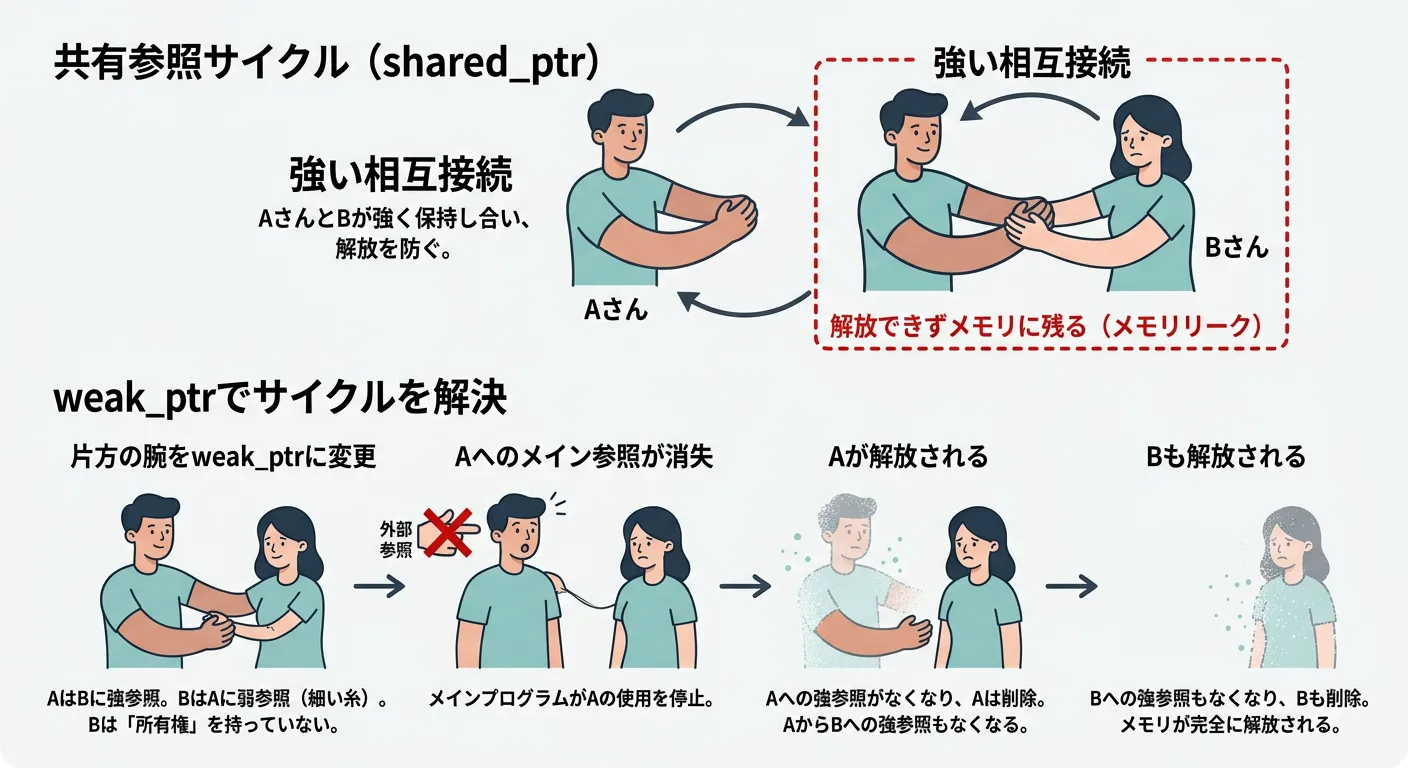 weak_ptrを使うことで、所有権のループを断ち切り、正しくメモリが管理されるようになりました。