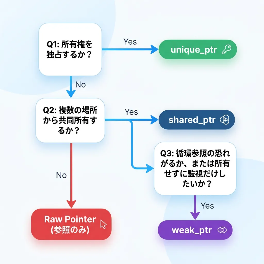 どのスマートポインタを使うべきか迷った際は、以下のフローチャートを参考にしてください。