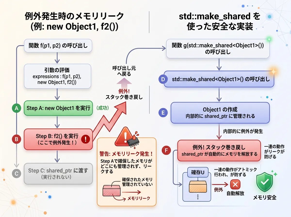 std::make_sharedが推奨されるもう一つの大きな理由は、例外安全性(Exception Safety)です。