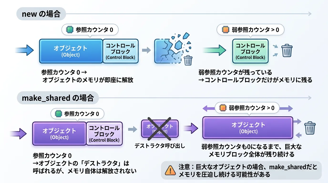 オブジェクトが非常に巨大(例:数メガバイトの配列を持つクラス)で、かつstd::weak_ptrがその寿命より長く存在する可能性がある場合、std::make_sharedを使うと「デストラクタは呼ばれているのに、巨大なメモリ領域が占有され続ける」という現象が発生します。