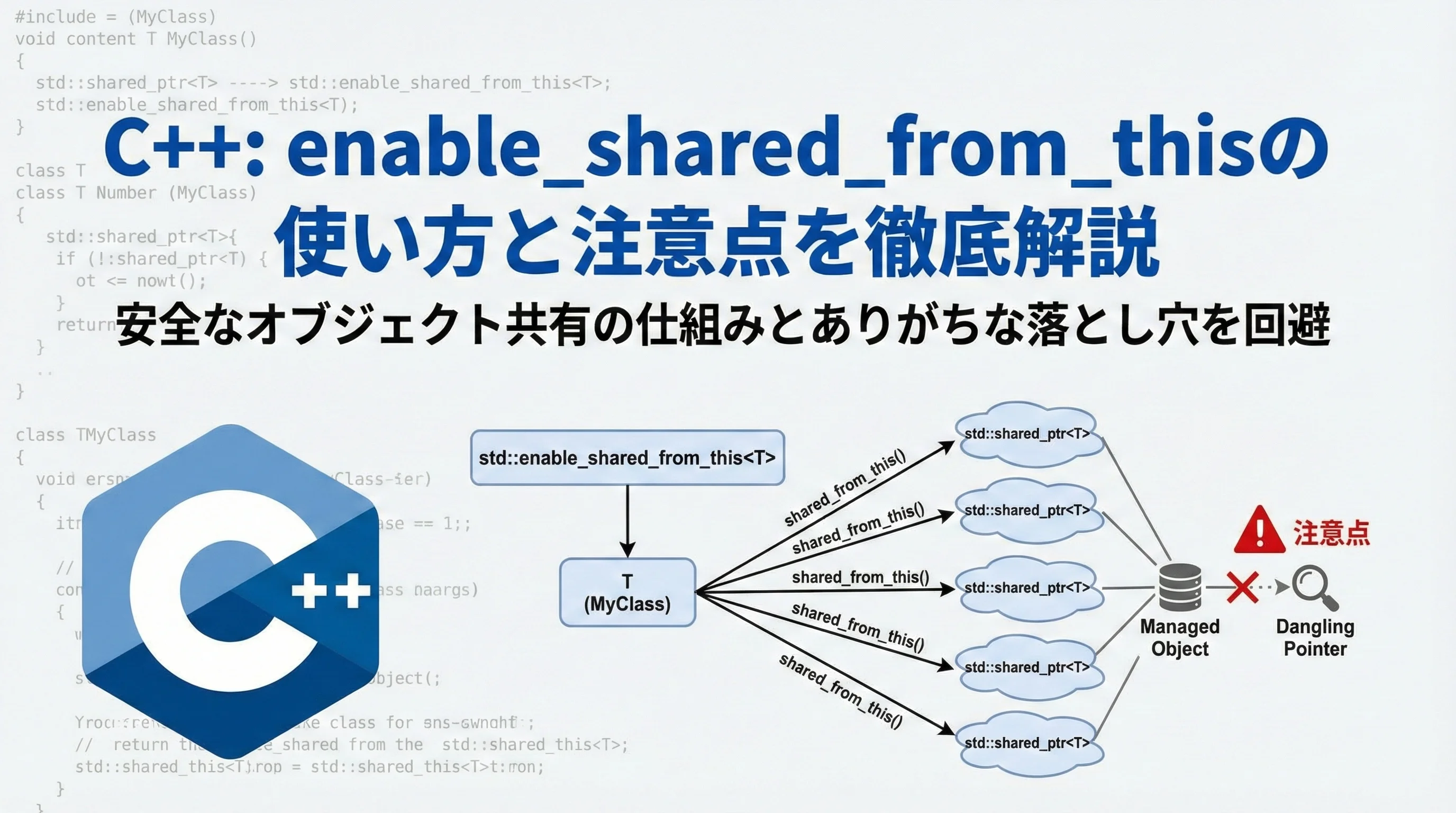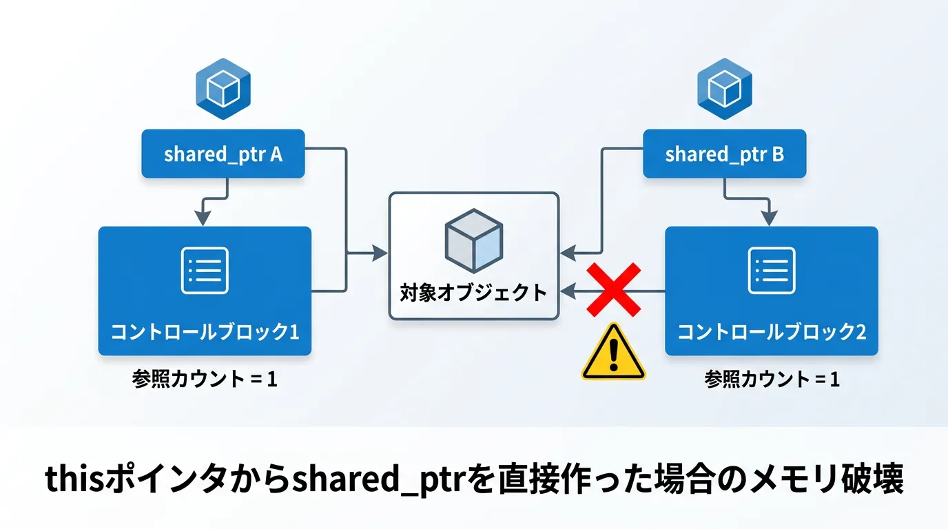 しかし、クラスのメンバ関数内で「自分自身を指すshared_ptr」を他の関数やコールバックに渡したい場合、単純な実装では深刻なバグを引き起こします。
