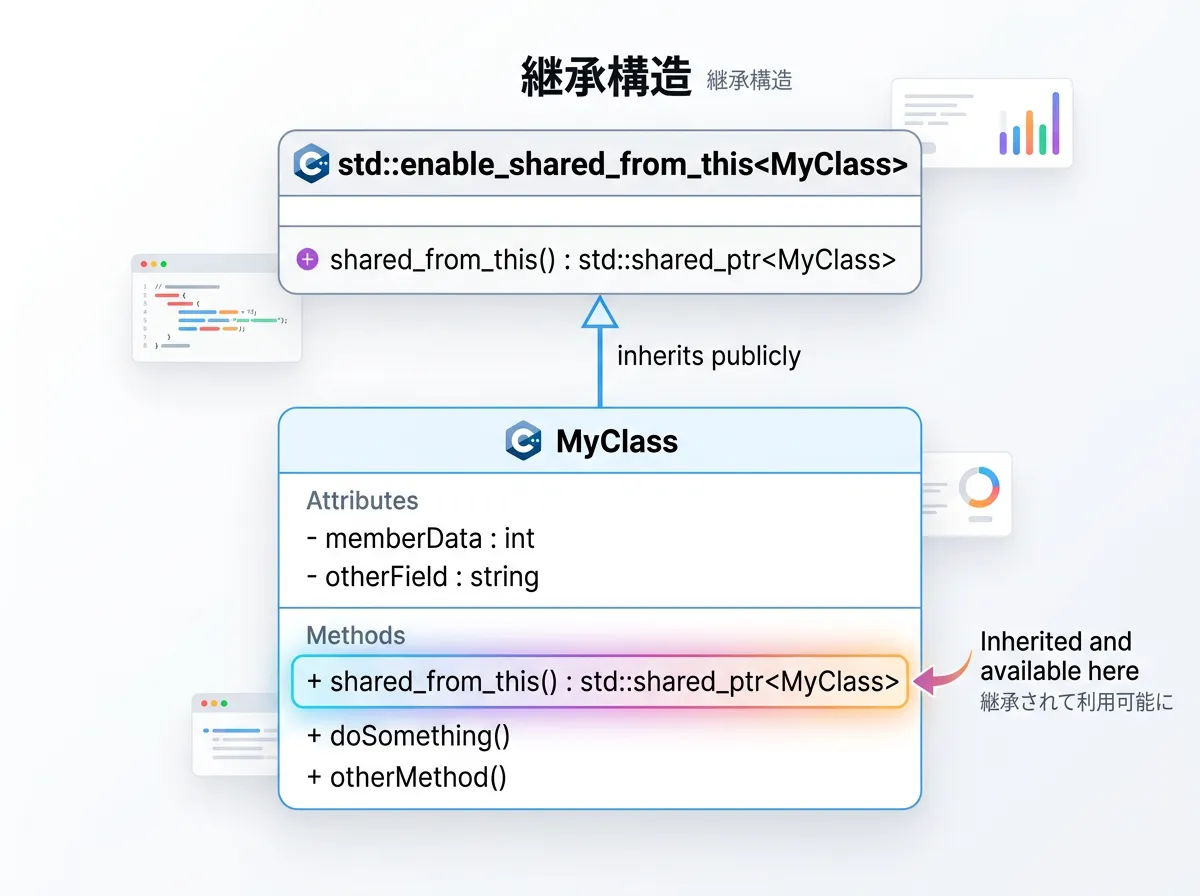 std::enable_shared_from_thisは、C++におけるオブジェクトの自己所有管理を安全に行うための必須コンポーネントです。