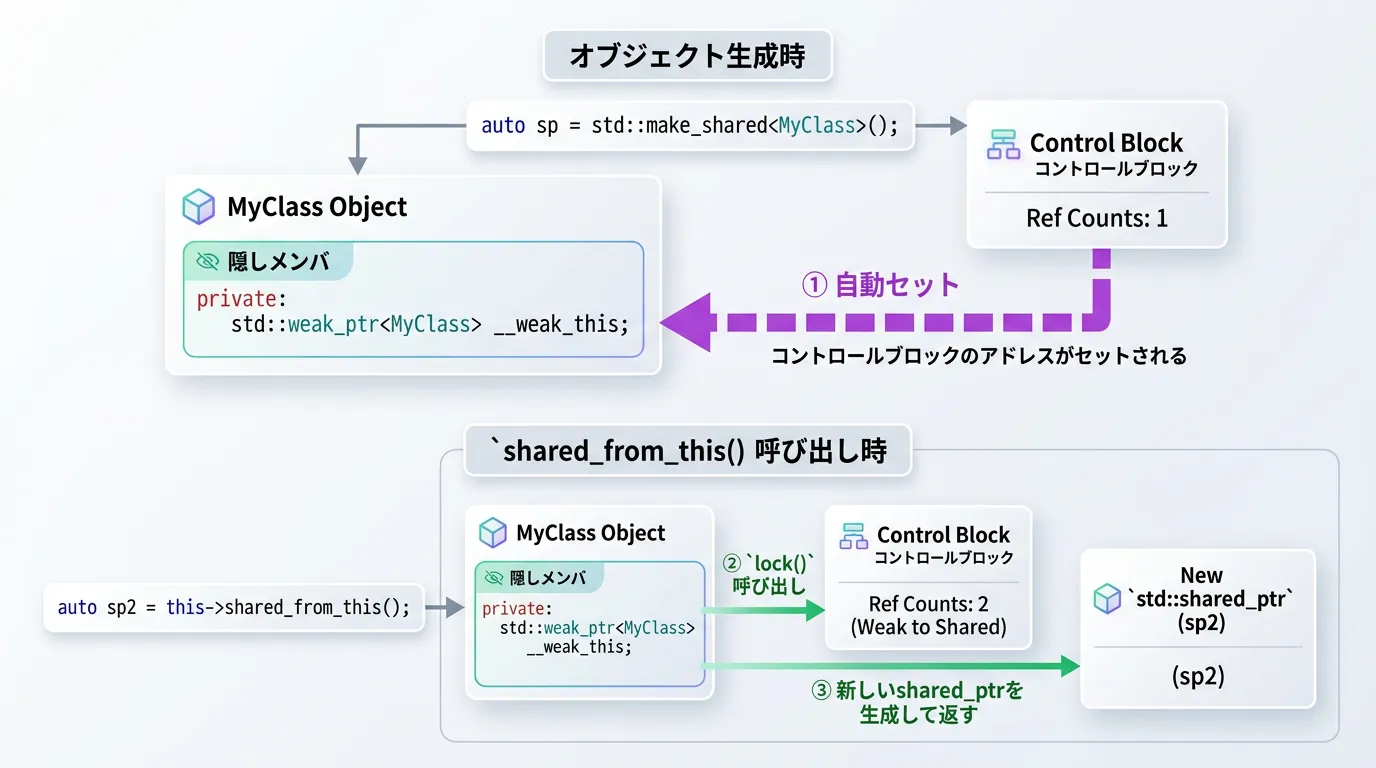 具体的には、オブジェクトが最初にstd::shared_ptrによって管理される際、そのshared_ptrのコンストラクタ(あるいはstd::make_shared内部)が、対象オブジェクトがenable_shared_from_thisを継承しているかをチェックします。