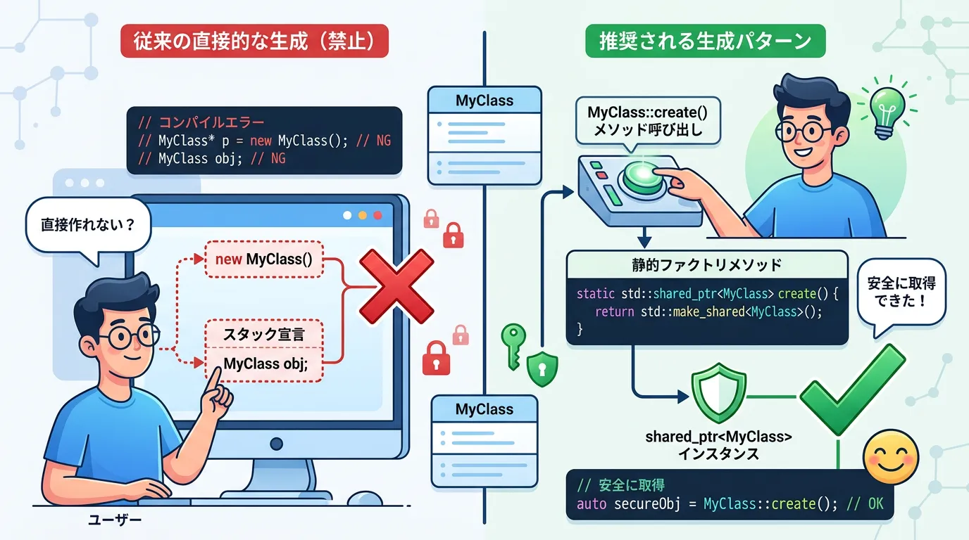 これにより、利用者が誤ってスタック上にオブジェクトを作ったり、生ポインタで管理したりすることをコンパイルレベルで禁止できます。