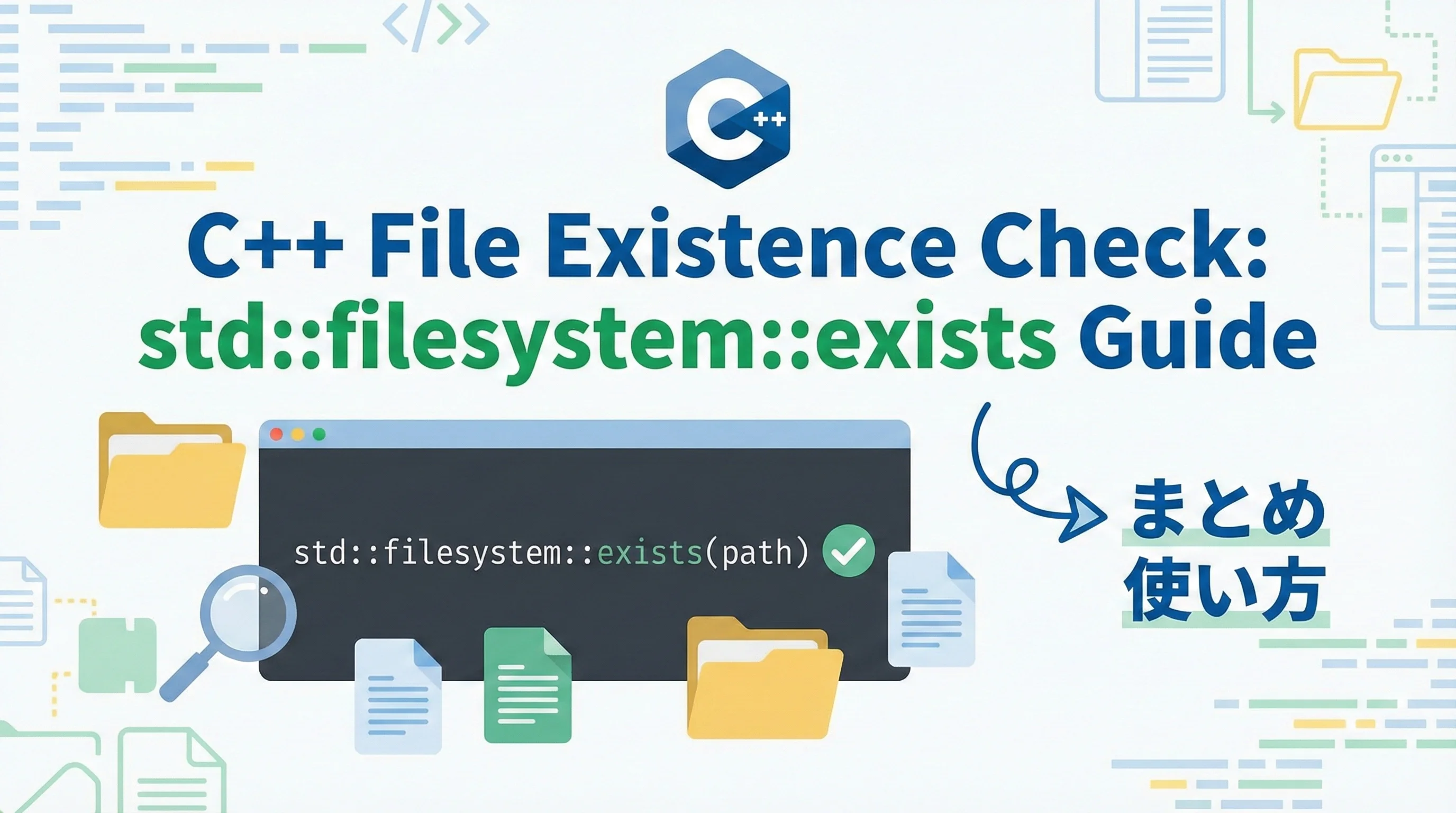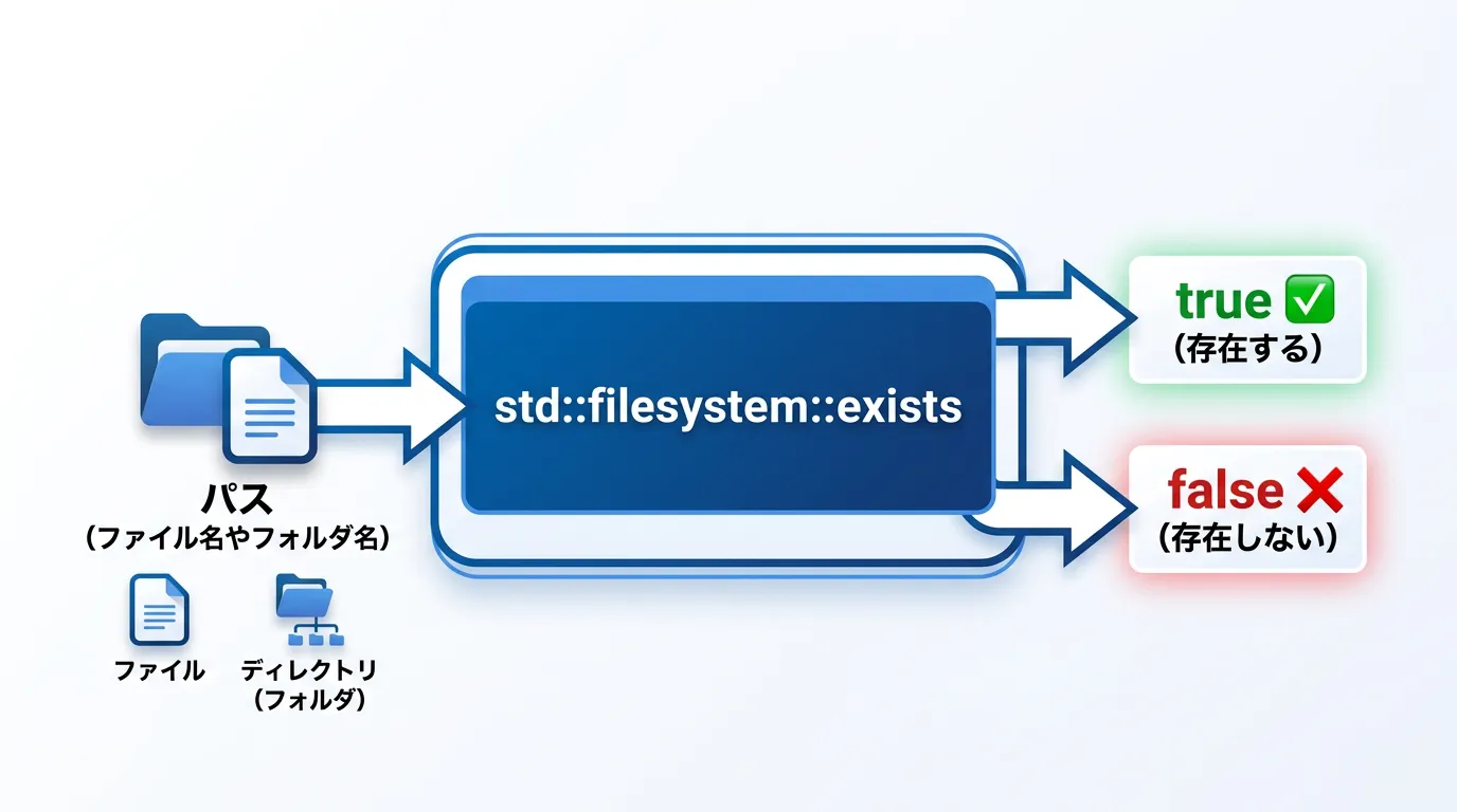C++17以降の標準となったstd::filesystem::existsは、ファイル存在確認における最も強力で簡潔な手段です。