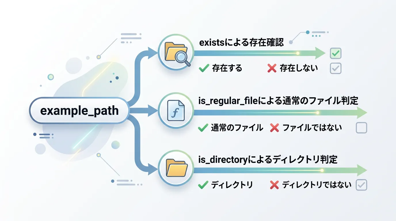 これらを区別するためには、is_regular_fileis_directoryといった関数を併用します。