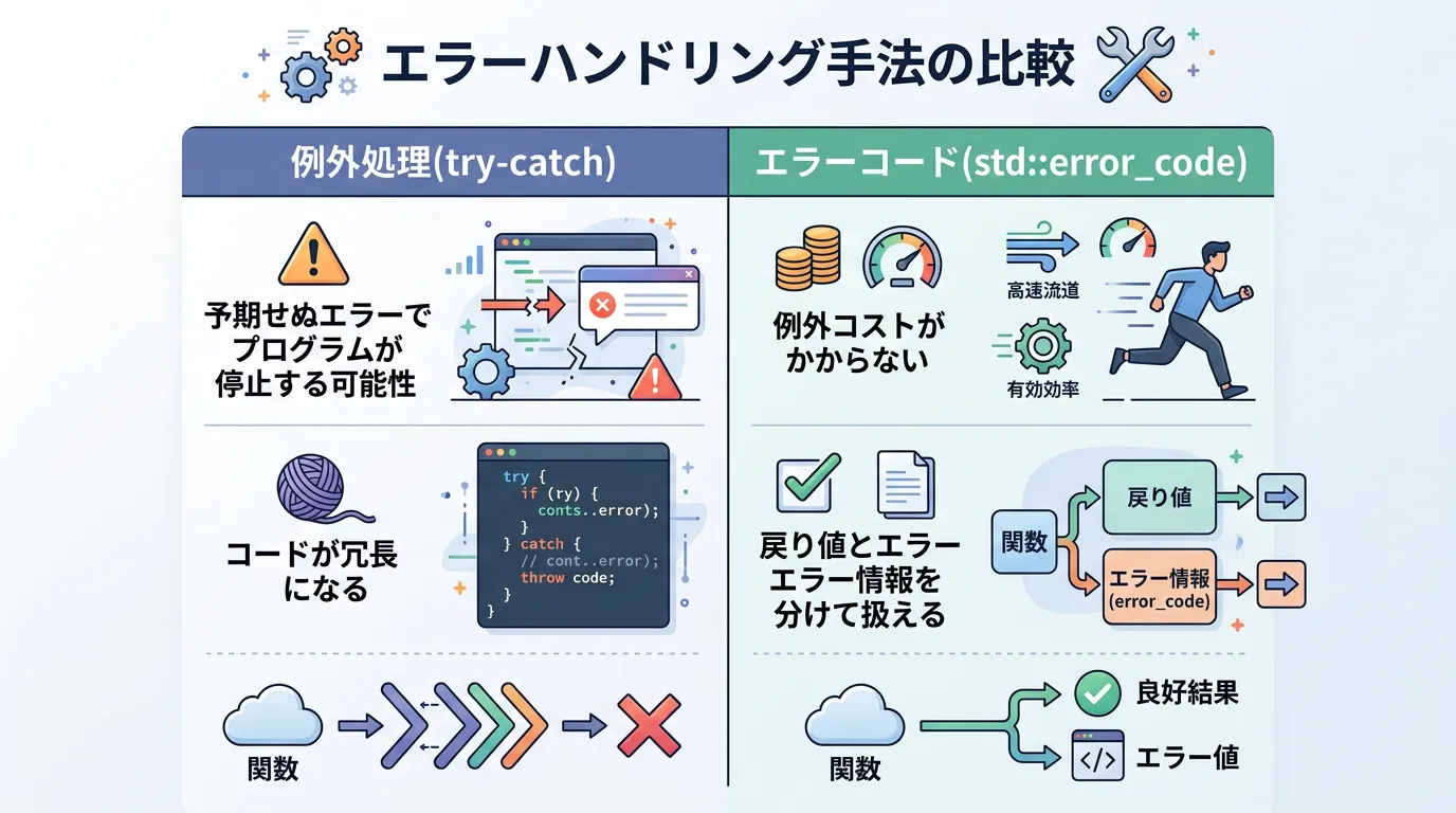 • パフォーマンスや安全性を重視する場合はstd::error_codeを活用し、例外を制御する。