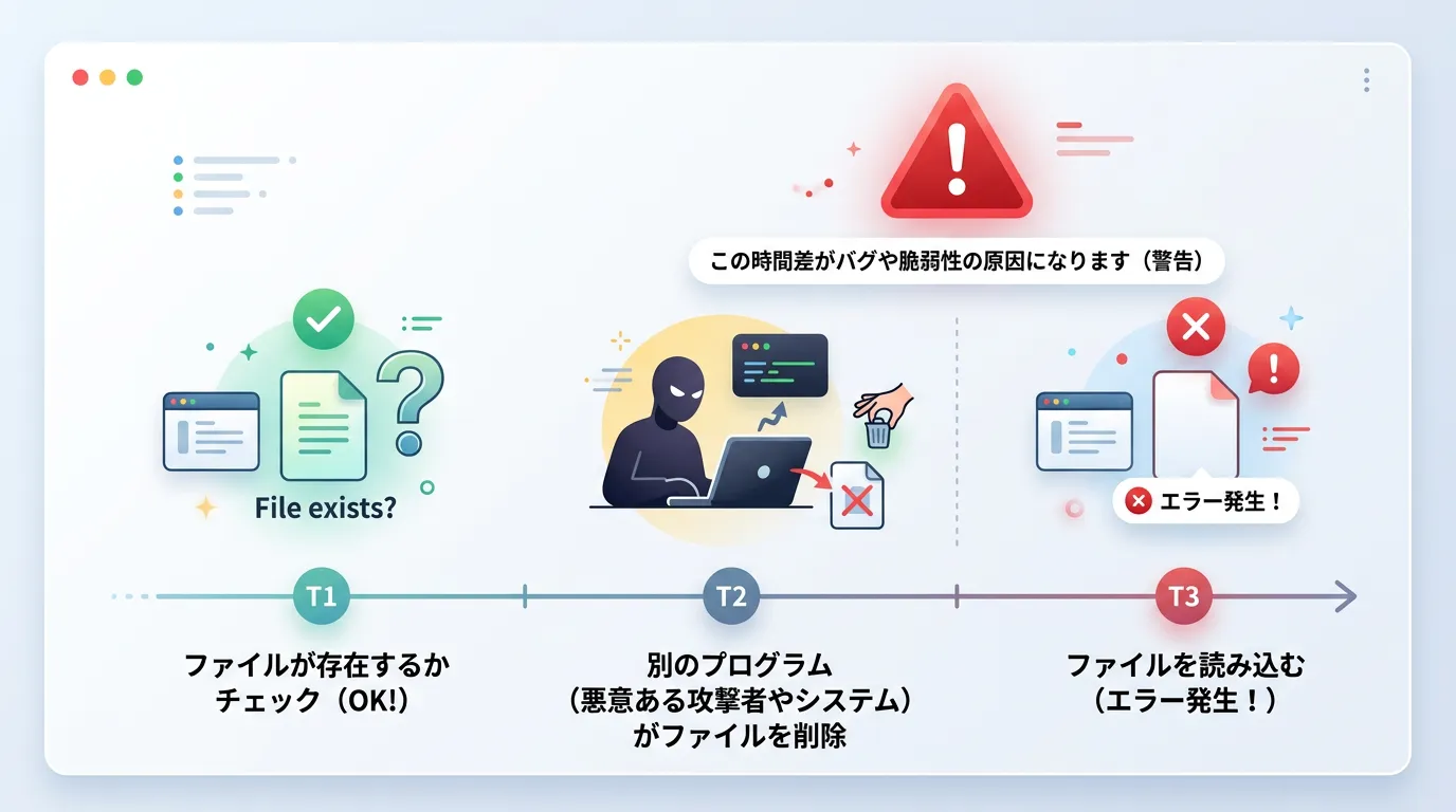 「存在を確認してから、実際にファイルを開くまでのわずかな時間」に、別のプロセスがそのファイルを削除したり変更したりする可能性があります。