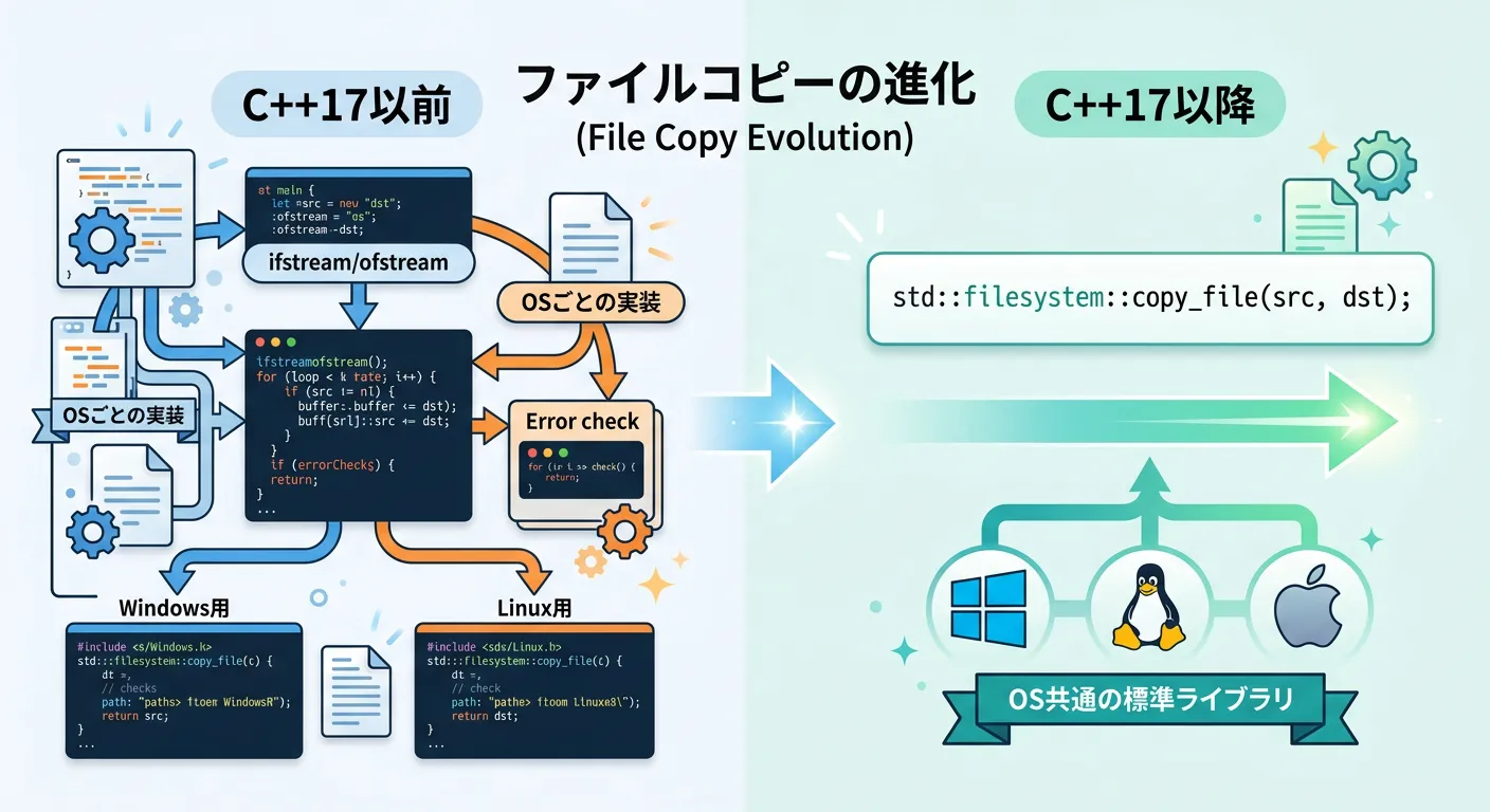 C++17が登場するまで、標準ライブラリだけでファイルをコピーする公式な「1行の関数」は存在しませんでした。