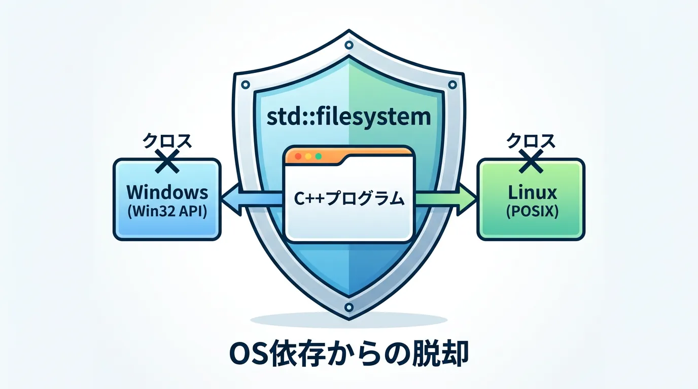 | 特徴 | 旧来の手法 (POSIX/Win32) | 現代の手法 (std::filesystem) |