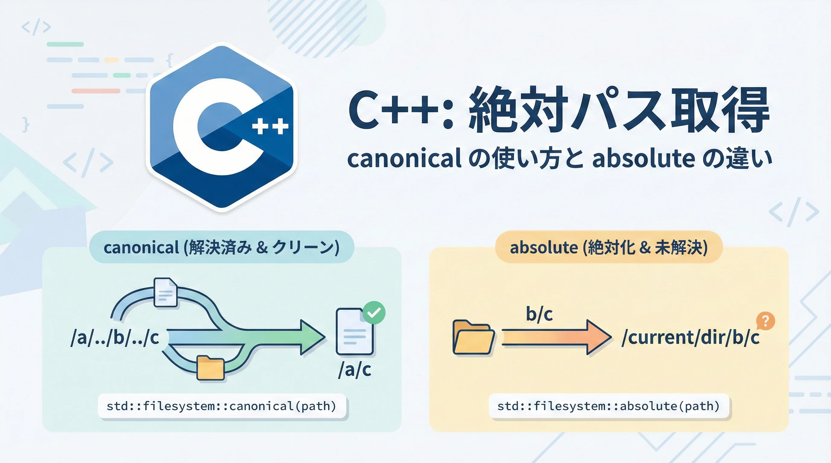 本記事では、絶対パスを取得するための中心的な機能であるstd::filesystem::canonicalとstd::filesystem::absoluteの違い、そして使い分けについて詳しく解説します。