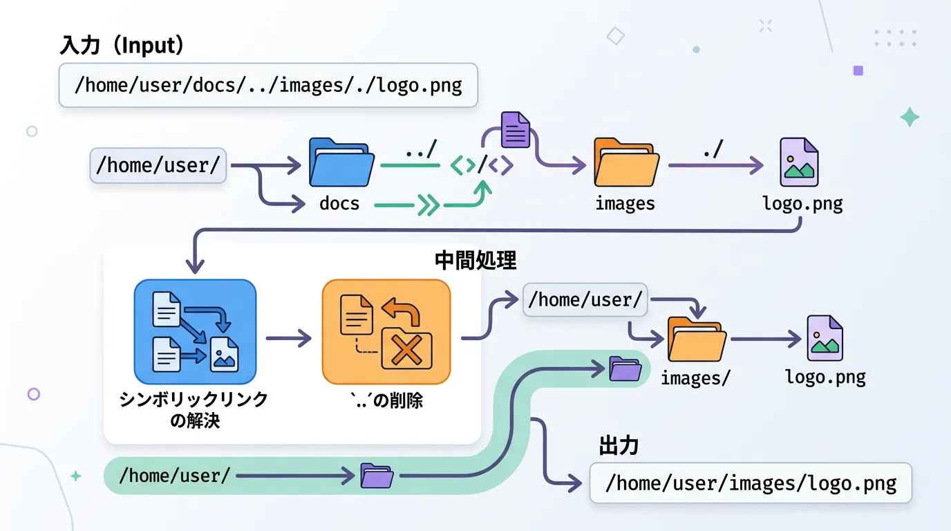 シンボリックリンクを経由している場合でも、リンク先の実際の実体パスを返してくれるため、セキュリティ上のチェックや重複排除に非常に役立ちます。
