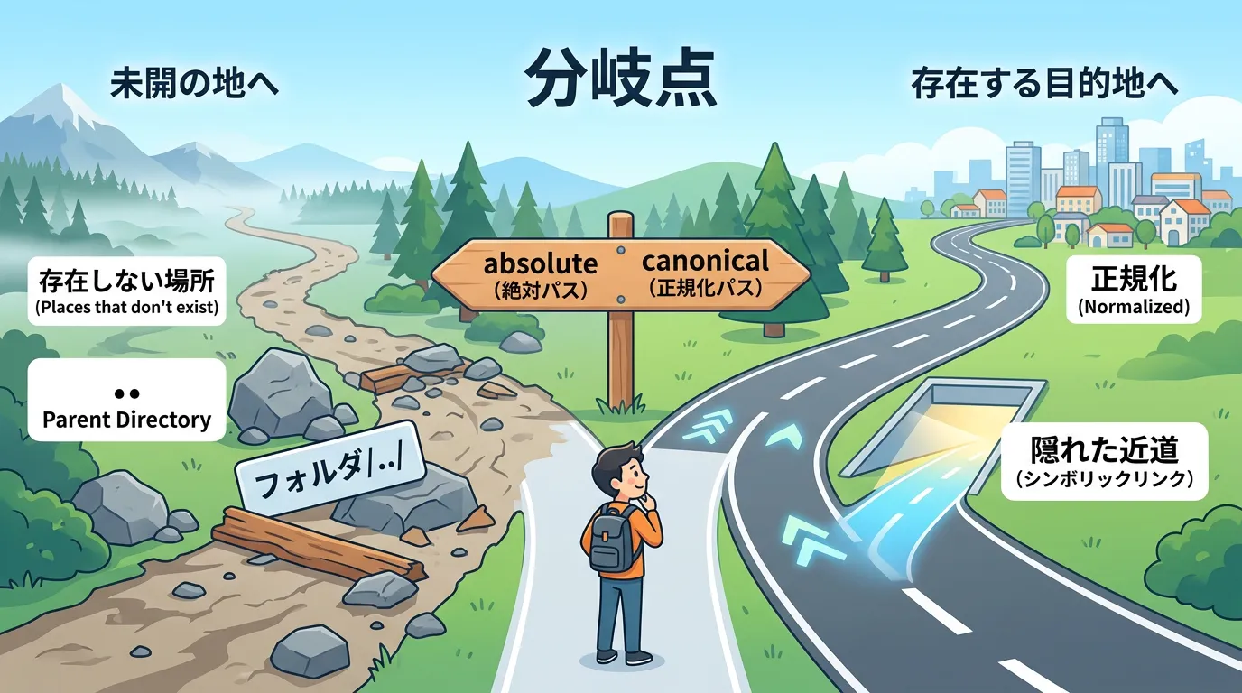 この厳密さにより、canonicalから得られたパスは常に一意であり、「そのパスがシステム上のどこを指しているか」を完全に保証することができます。