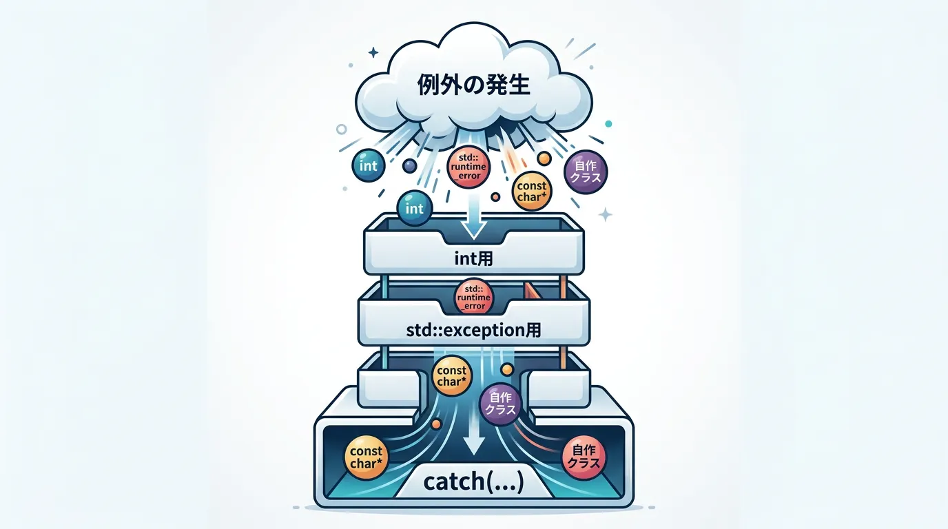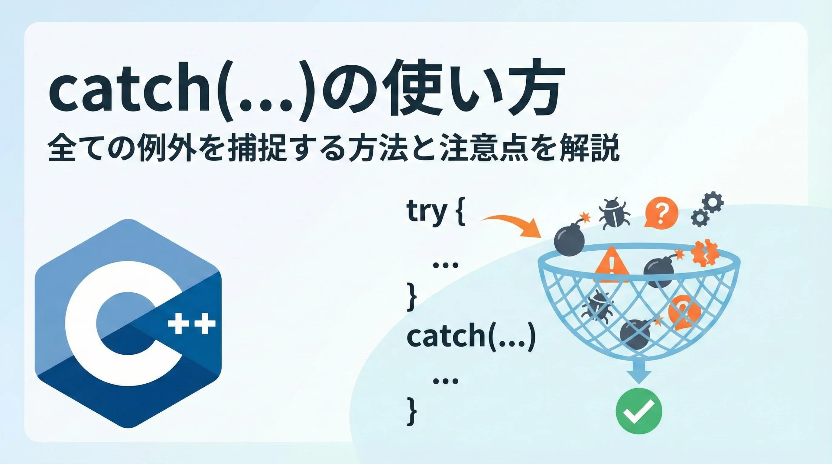 本記事では、catch(…)の基本的な使い方から、実戦で役立つテクニック、そして使用上の注意点までを詳しく解説していきます。