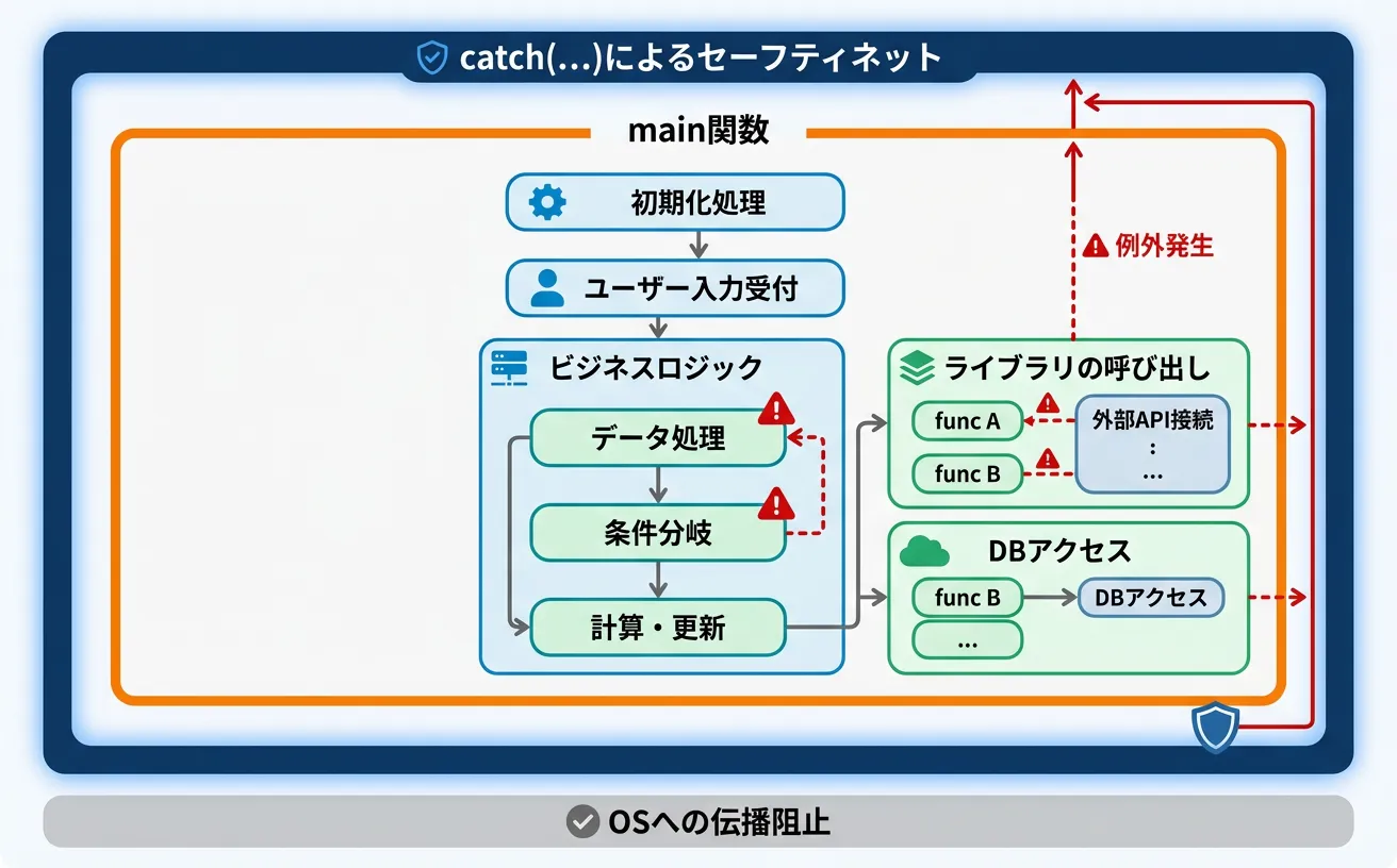 プログラムの異常終了(クラッシュ)を防ぐための「最後の砦」として、型を特定できない例外を全て拾い上げるためにcatch(...)が利用されます。