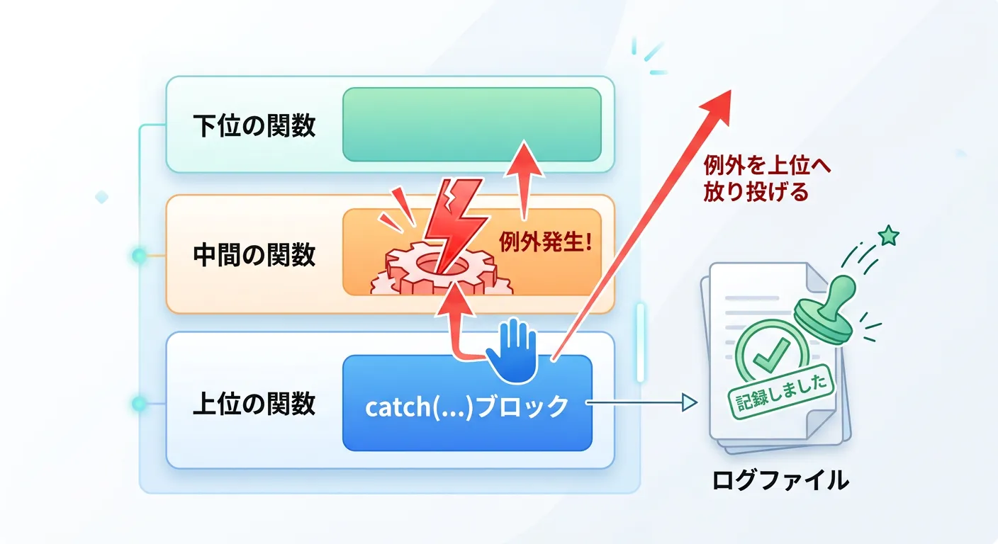 この方法の利点は、catch(...)で一時的に割り込みつつも、本来の例外の型情報を失わずに上位の適切なハンドラに処理を任せられる点にあります。