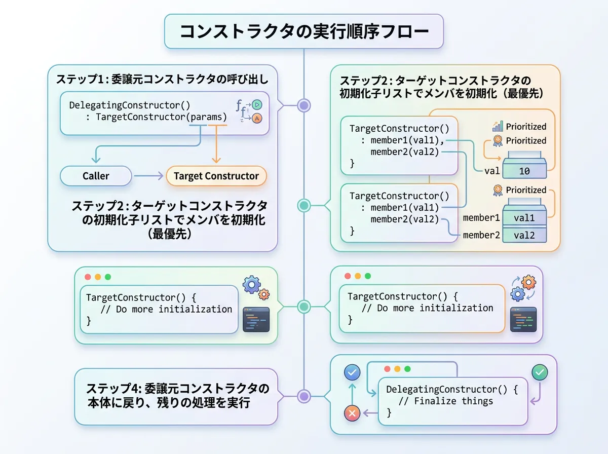 委譲コンストラクタは、C++におけるクラス設計の質を一段階引き上げる強力な機能です。