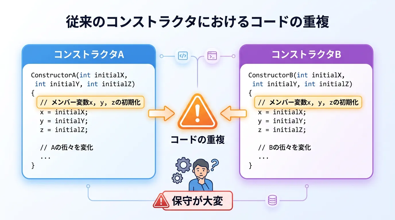 しかし、それぞれのコンストラクタで同じような初期化処理を記述すると、コードが重複し、保守性が低下する原因となります。