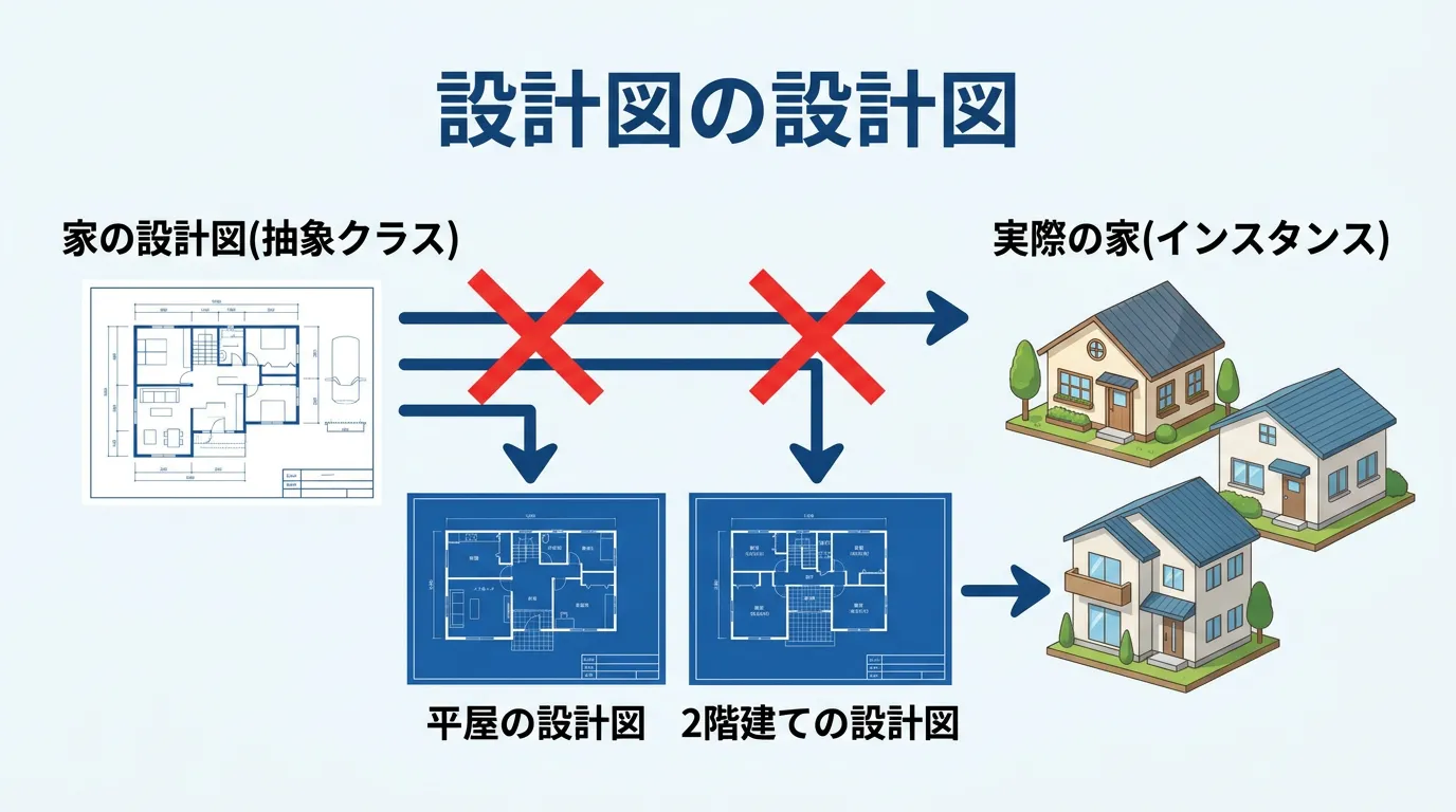抽象クラスは、それ単体で実体を作るためのものではなく、他のクラスの「設計図」として機能するための特殊なクラスです。