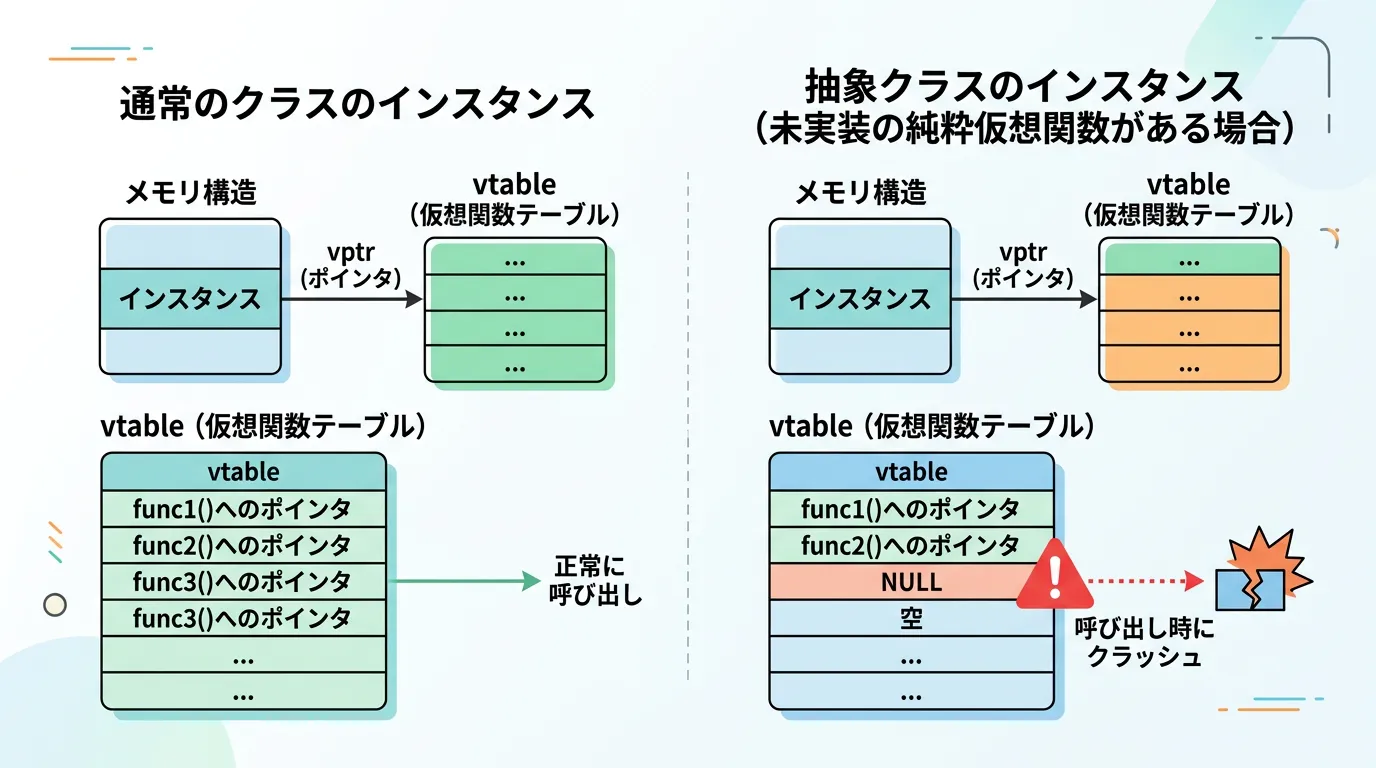 もし抽象クラスのインスタンス化を許可してしまうと、プログラムがその未定義の関数を呼び出した瞬間に実行時エラー(クラッシュ)を引き起こしてしまいます。