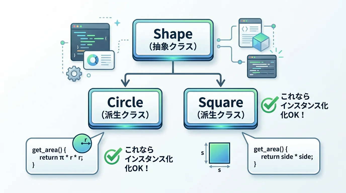 上記のコードでは、Circleクラスがget_area関数の具体的な内容を提供しているため、インスタンス化が可能になります。
