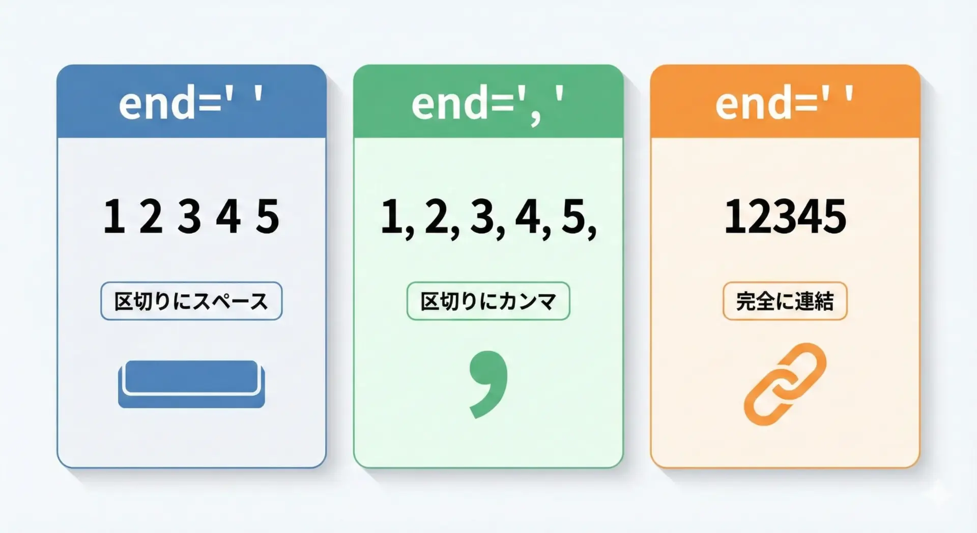 ここでend引数を変更することで、改行をなくしたり、スペースやカンマなど任意の文字に変えることができます。