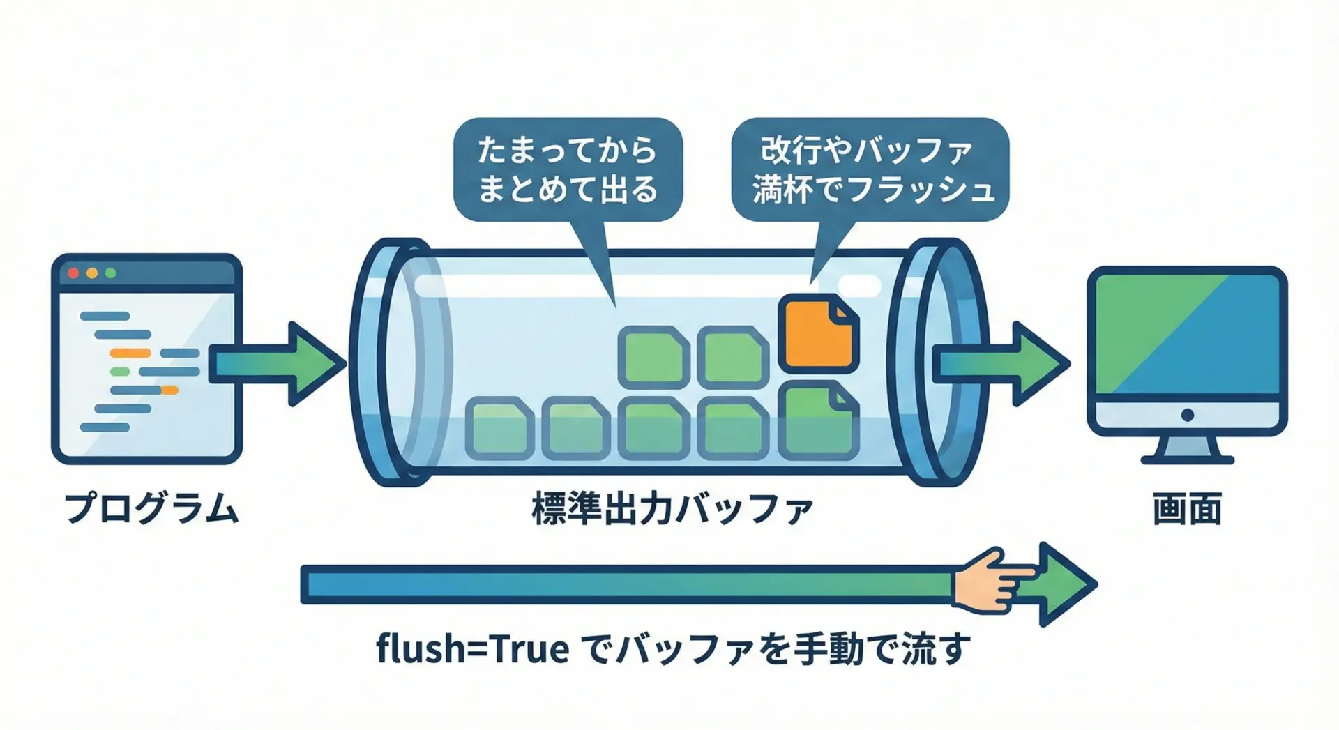 この仕組みは通常意識しなくてかまいませんが、リアルタイム性が重要な場面(プログレスバーや進捗表示など)では、バッファにたまったまま画面に出てこないことが問題になります。