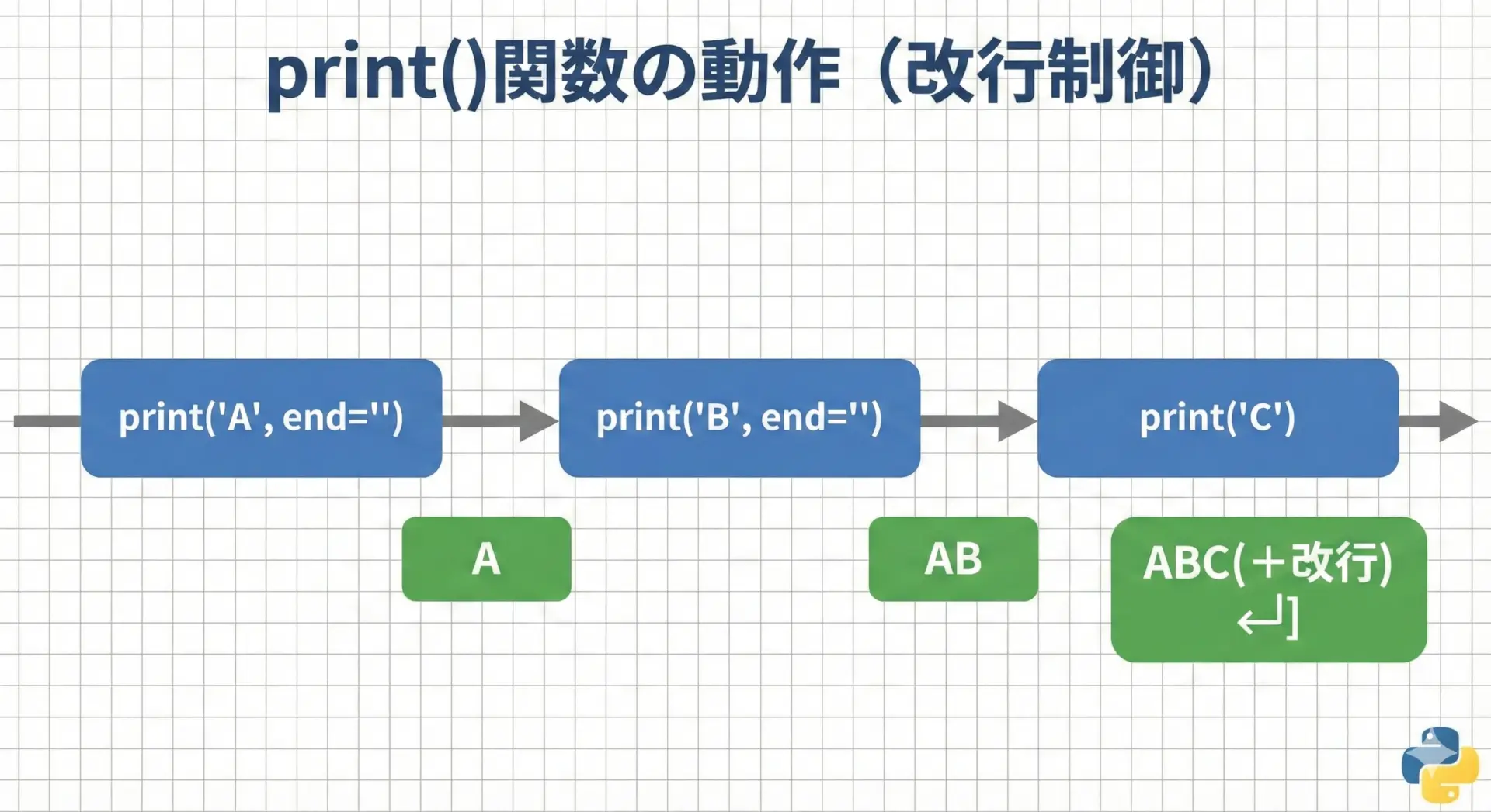 上の例では、1行目と2行目のprintは改行を挿入していないため、「ABC」1行で出力されます。