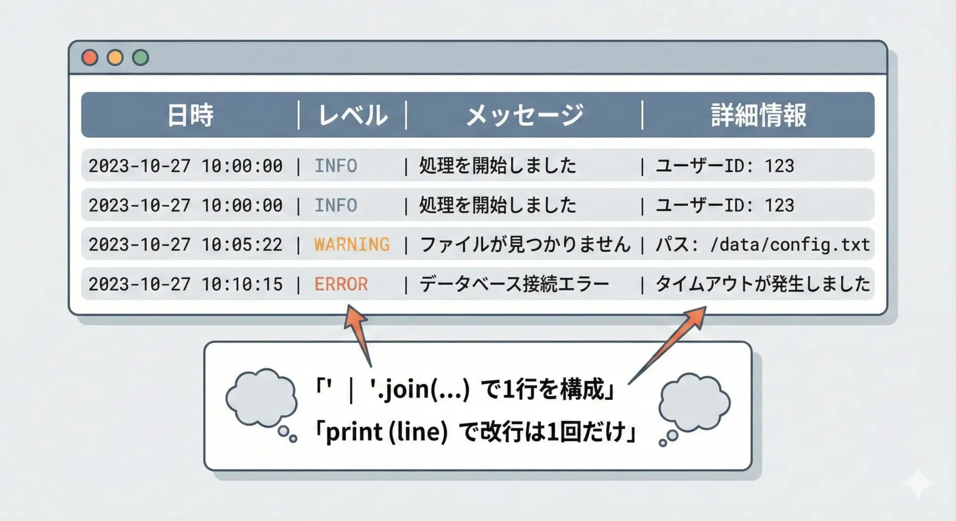 日時・ログレベル・メッセージ・ユーザーIDなど、複数の要素をきれいに並べるためにjoinが活躍します。