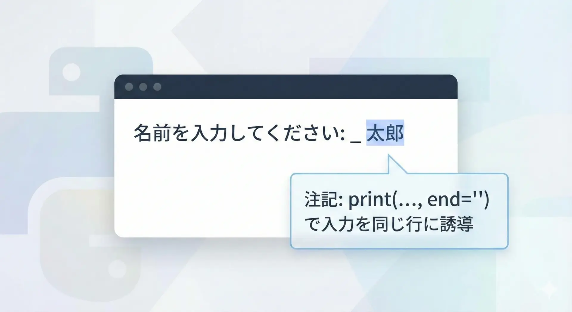 Python標準のinput関数にもprompt引数がありますが、より柔軟な表現をしたい場合や、複雑なフォーマットを組んでから表示したい場合にはprint(..., end='')が役立ちます。