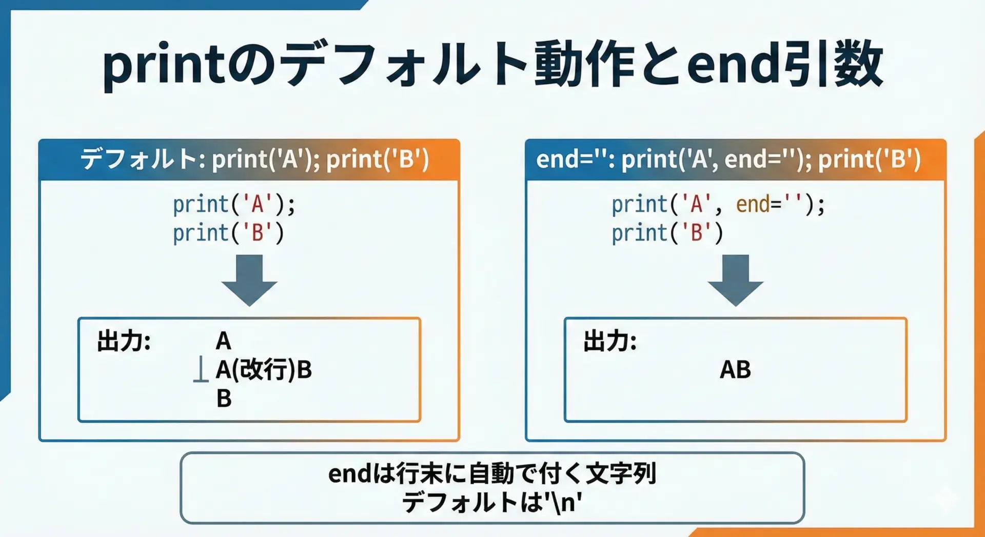 endは「行の末尾に何を付けるか」を指定する引数で、デフォルト値は'\n'(改行)です。
