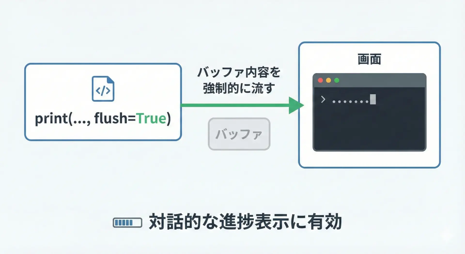print関数にはflush引数があり、これをTrueに設定すると、そのprintの出力直後にバッファを強制的にフラッシュします。
